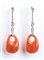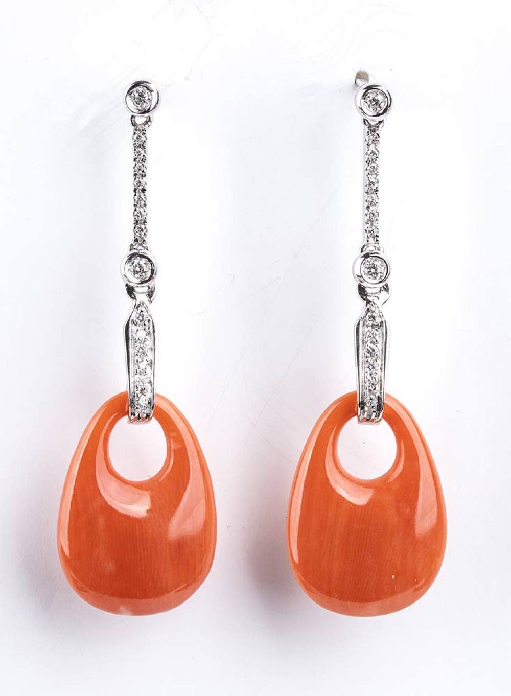oro bianco 18k, ciascuno con elemento in corallo Cerasuolo (corallium elatius) sospeso ad una linea di diamanti taglio brillante 0,40 ct circa, H, VS. Punzonati "750". Lunghezza 50 mm. Peso 7,5 gr. Stato di conservazione: ***** eccellente.