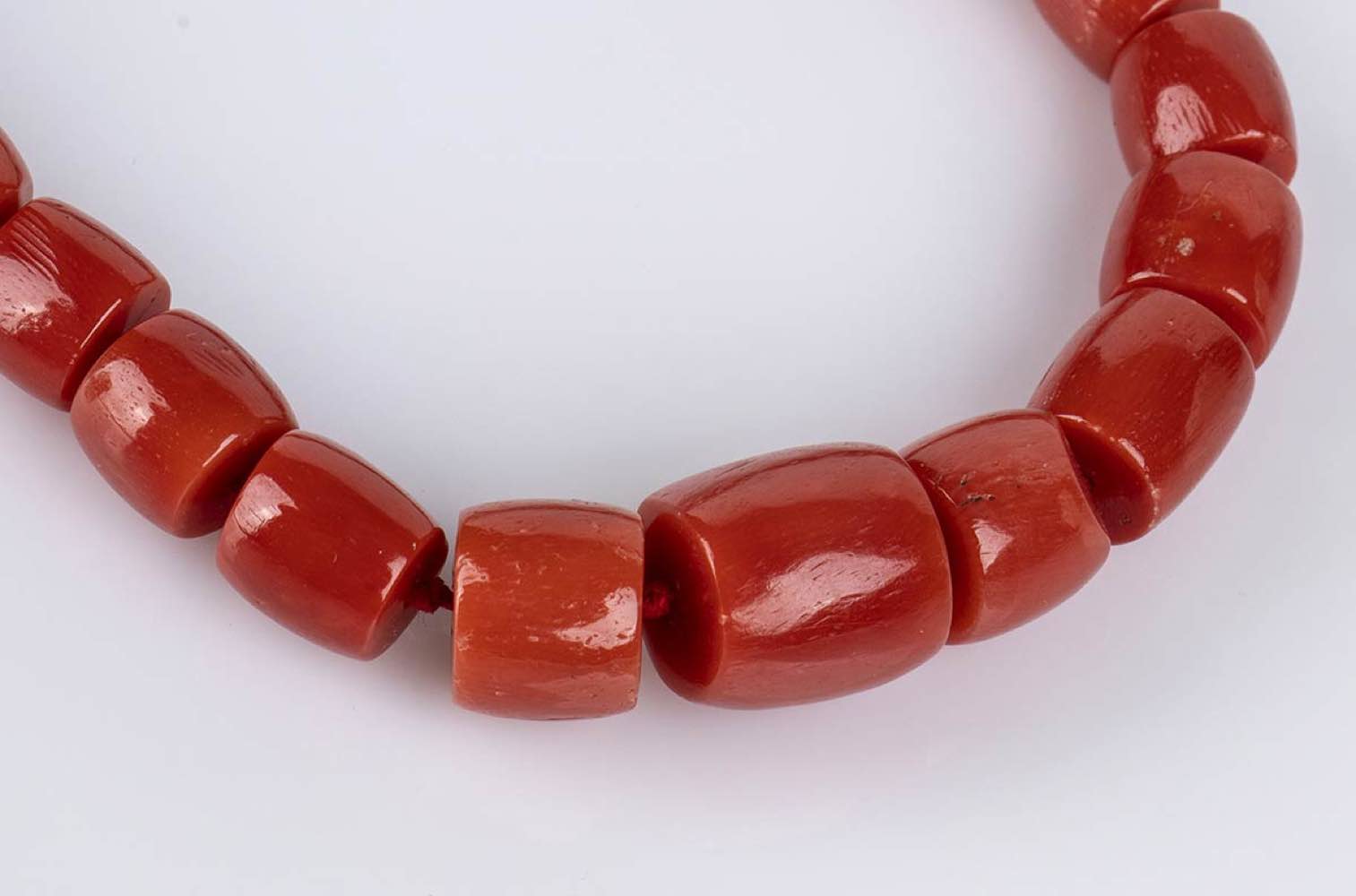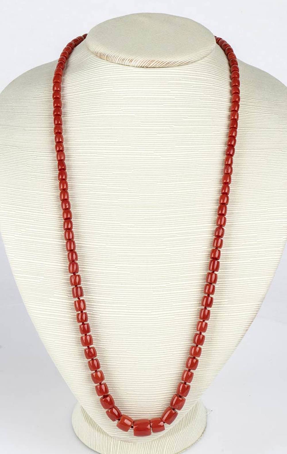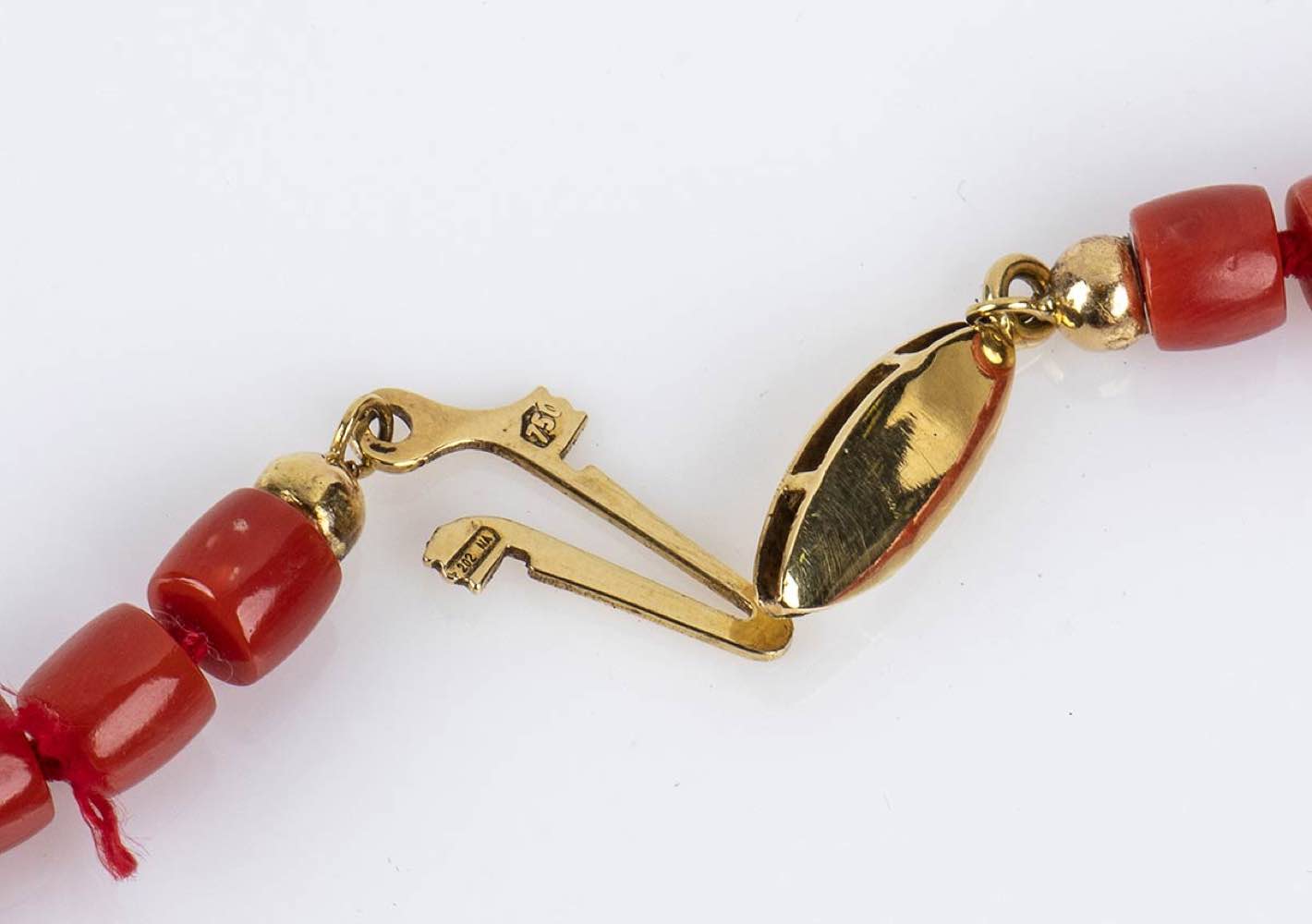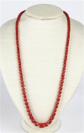 oro giallo 18k, barilotti di corallo Mediterraneo (corallium rubrum) disposti in gradazione. Punzonato "750". Lunghezza 72 cm. Peso 54,3 gr. Stato di conservazione: ***** eccellente.
