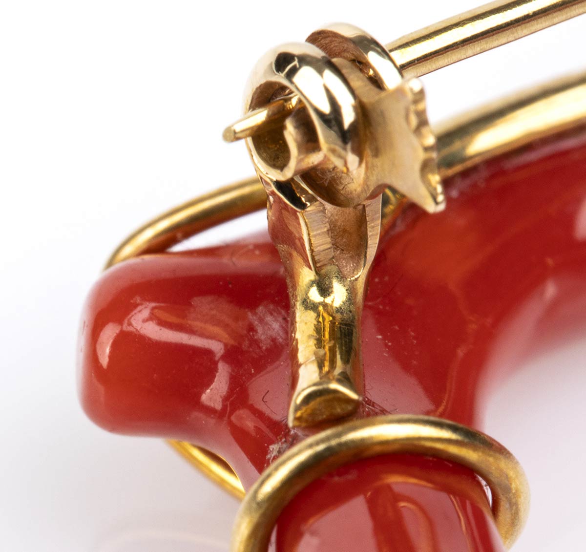 oro giallo 18k, incastonato con piccolo ramo di corallo Mediterraneo (corallium rubrum). Punzonato "750". Dimensioni 50 x 50 mm. Peso 5,9 gr. Stato di conservazione: ***** eccellente.