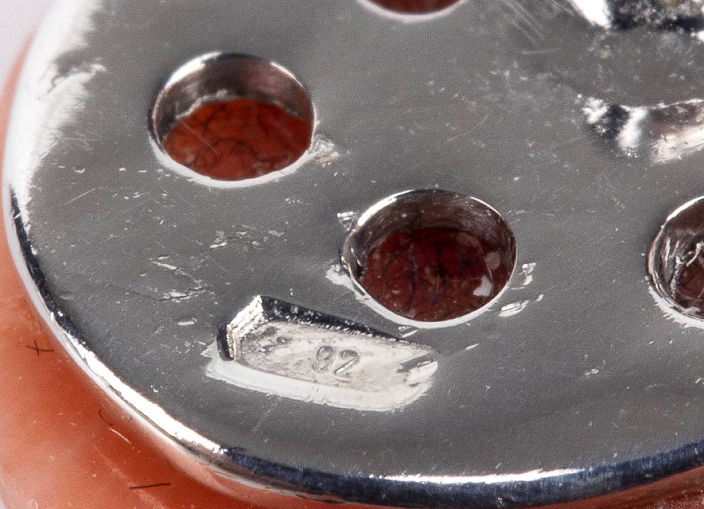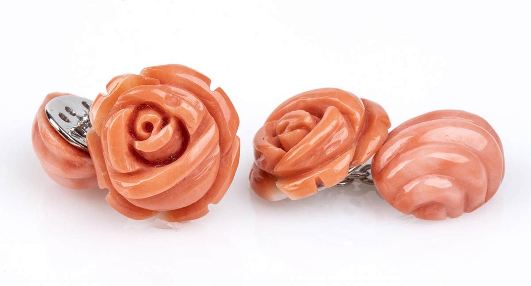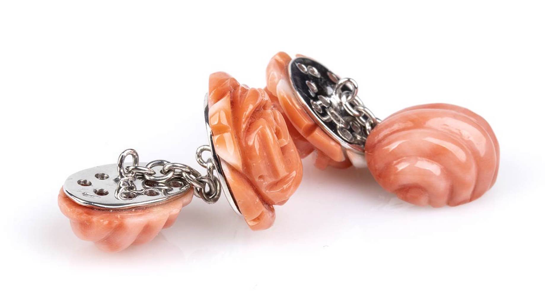 oro giallo 18k, ciascuno con coppia di motivi floreali scolpiti in corallo Cerasuolo (corallium elatius). Punzonati "750" e "92 CE". Dimensione fronte 15 x 15 mm. Peso 8,5 gr. Stato di conservazione: ***** eccellente.