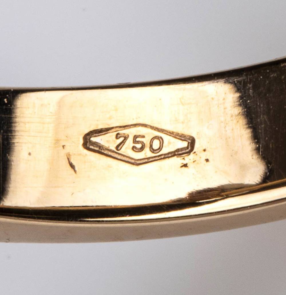 oro giallo 18k, con corallo rosa (corallium secundum) affiancato da diamanti taglio brillante 0,55 ct circa, G, VVS-VS e quarzi citrini. Punzonato "750". Peso 9,4 gr. Misura IT 11,5 - Misura US 6. Stato di conservazione: ***** eccellente.