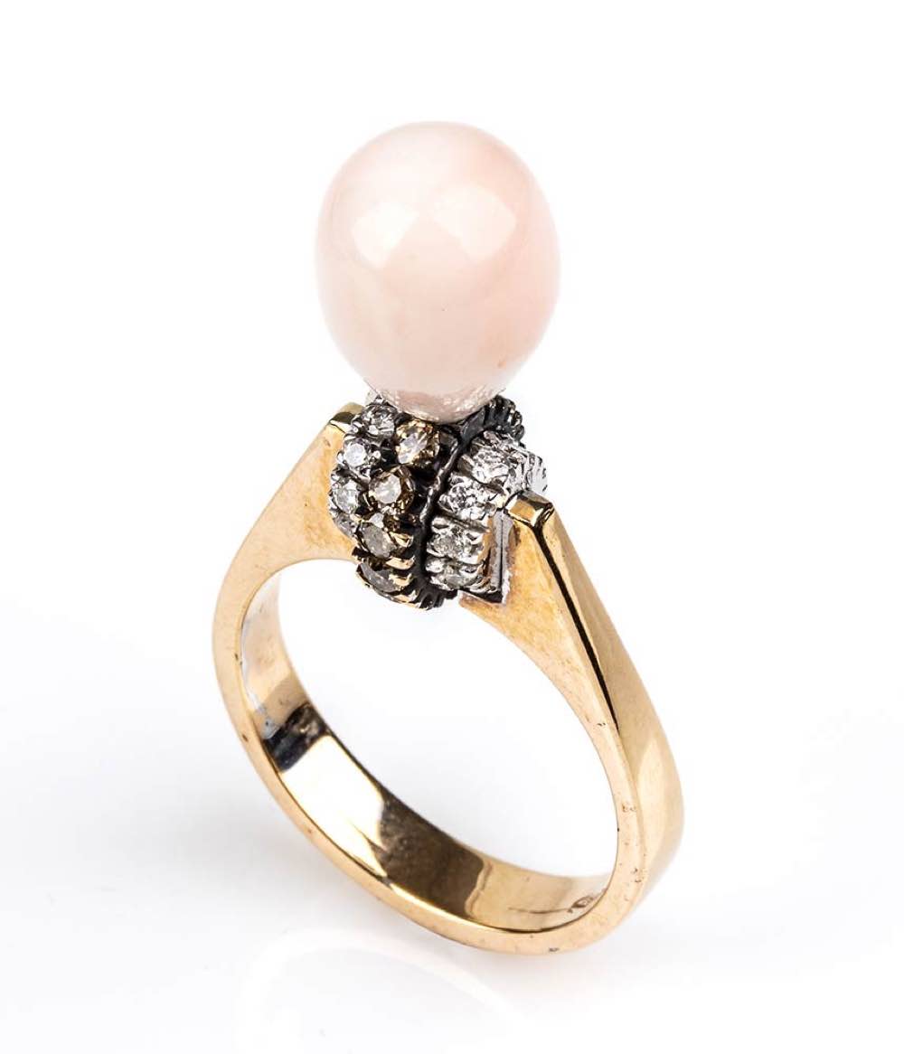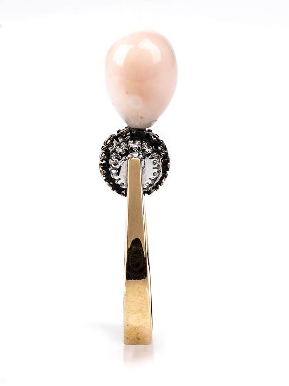 Anello in oro, corallo rosa diamanti bianchi e diamanti brown