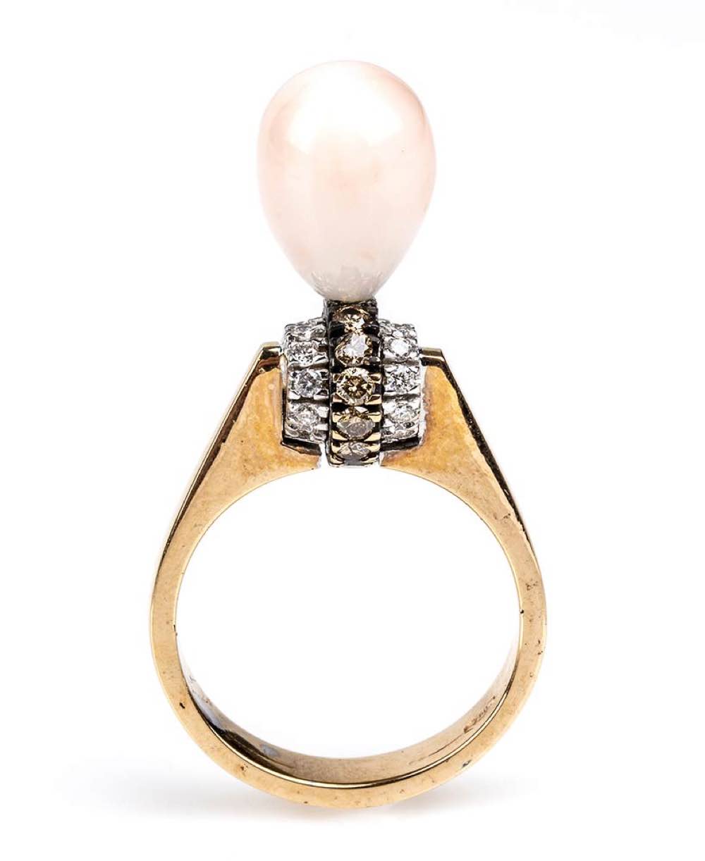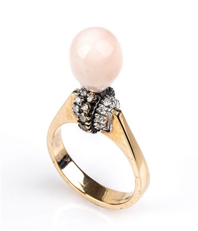 oro giallo ed oro bianco, 18k, con corallo rosa (corallium regale), diamanti taglio brillante bianchi 0,22 ct circa, G, VS; diamanti brown 0,37 ct. Punzonato "750". Peso 8,9 gr. Misura IT 14- Misura US 7. Stato di conservazione: ***** eccellente.