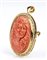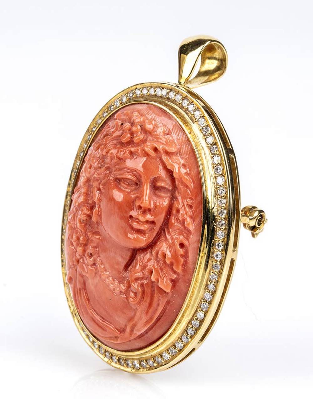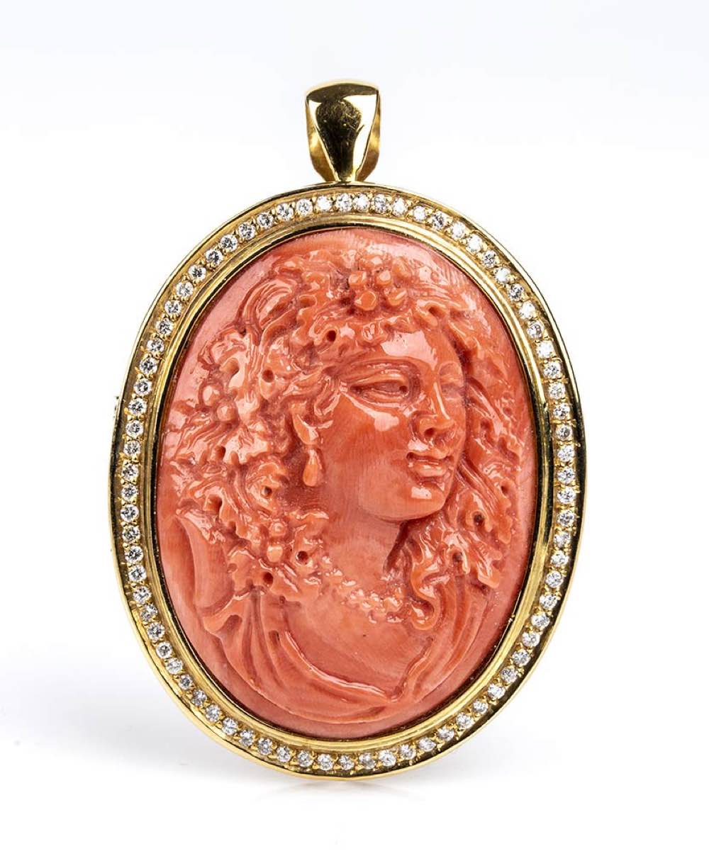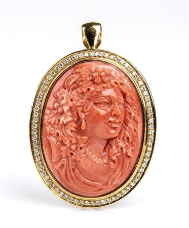 oro giallo 18k, di forma ovale, incastonata con cammeo scolpito in corallo Cerasuolo (corallium elatius) raffigurante profilo femminile con capelli mossi con cornice in diamanti taglio brillante 0,75 ct circa, H, VS. Punzonata "750". Dimensioni 50 x 35 mm. Peso 16,4 gr. Stato di conservazione: ***** eccellente.