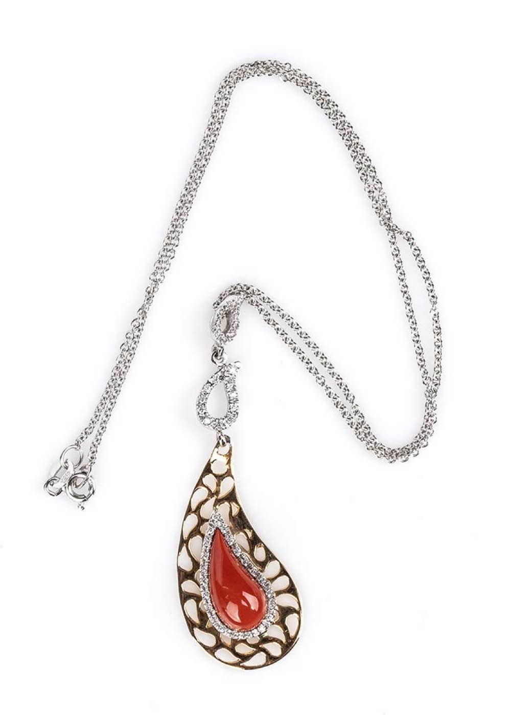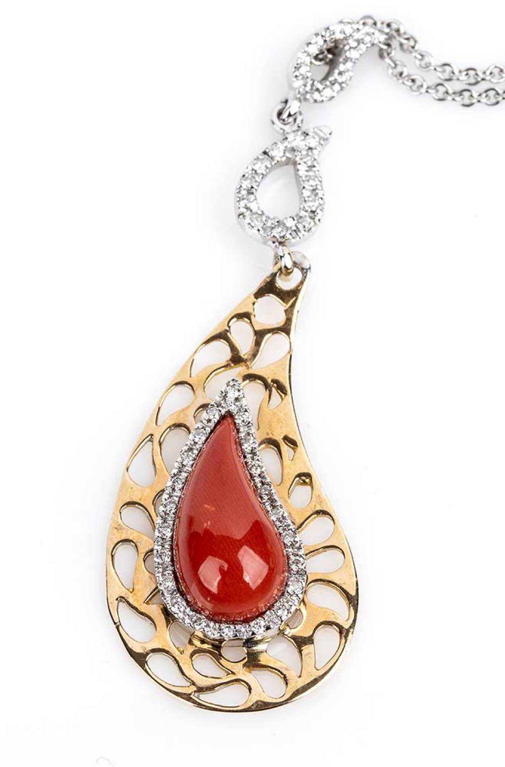 oro bianco e giallo 18k, catena a maglia forzatina a cui é sospeso un pendente traforato, incastonato con cabochon di corallo Cerasuolo (corallium elatius), dettaglio in diamanti taglio brillante 0,23 ct circa, G, VS-SI. Punzonato "750". Lunghezza pendente 60 mm. Lunghezza girocollo 40 cm. Peso 8,2 gr. Stato di conservazione: ***** eccellente.