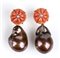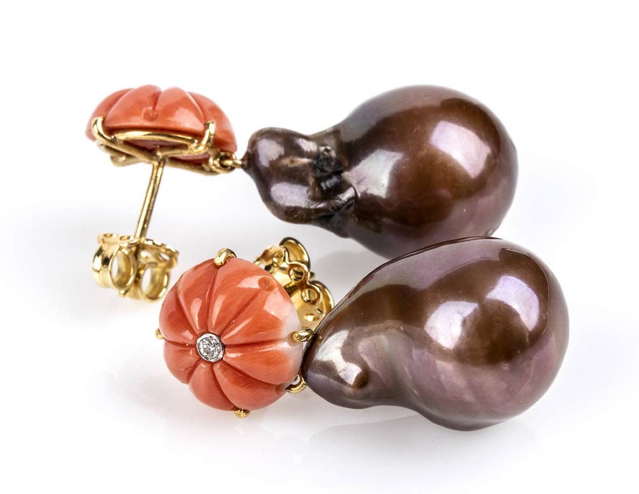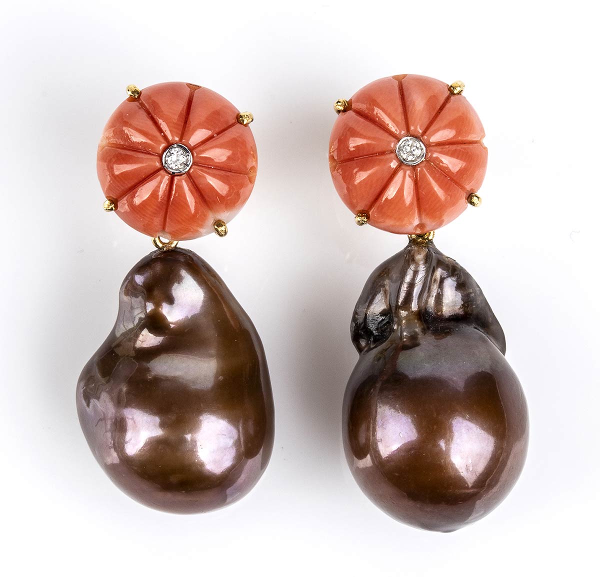 oro giallo 18k, ciascuno con fiore scolpito in corallo Cerasuolo (corallium elatius ), incastonato al centro con piccolo diamante taglio brillante 0,02 ct circa totali, a cui é sospesa una perla coltivata d'acqua dolce. Punzonati "750". Lunghezza 35 mm. Peso 14,1 gr. Stato di conservazione: ***** eccellente.