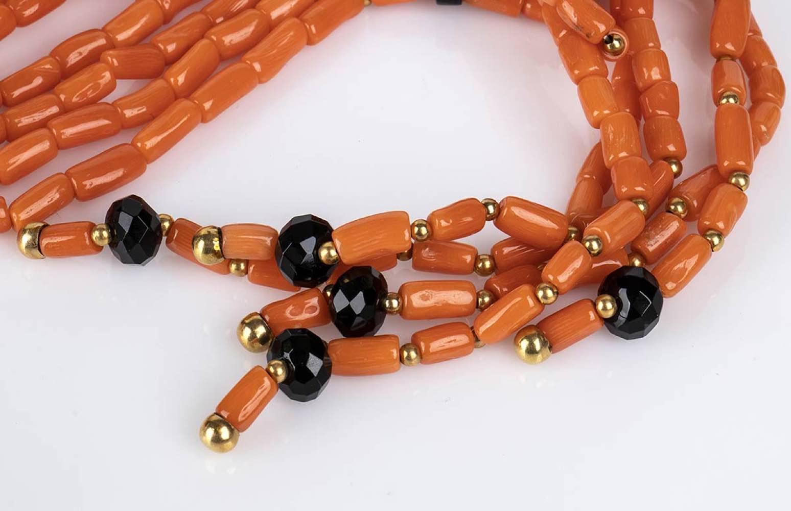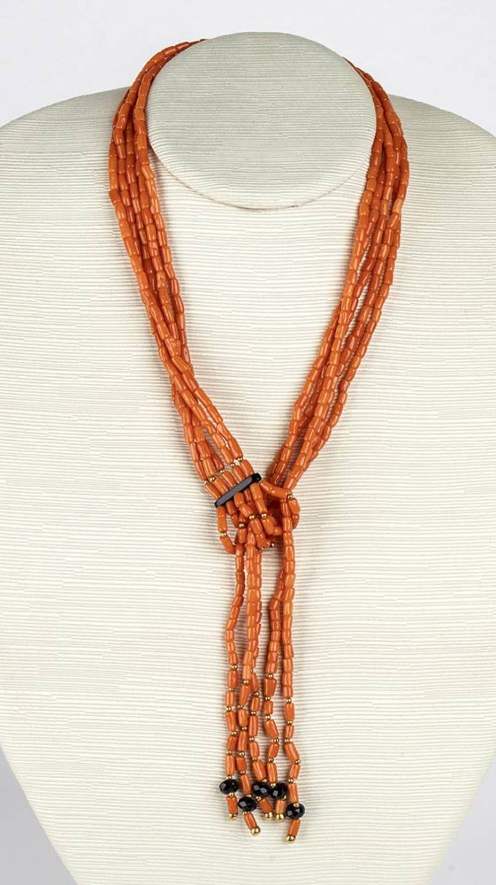 cilindretti di corallo Mediterraneo (corallium rubrum) con inserti in onice e oro giallo 18k. Lunghezza 63 cm, diametro corallo 3,5-4 mm. Peso 82,2 gr. Stato di conservazione: ***** eccellente.
