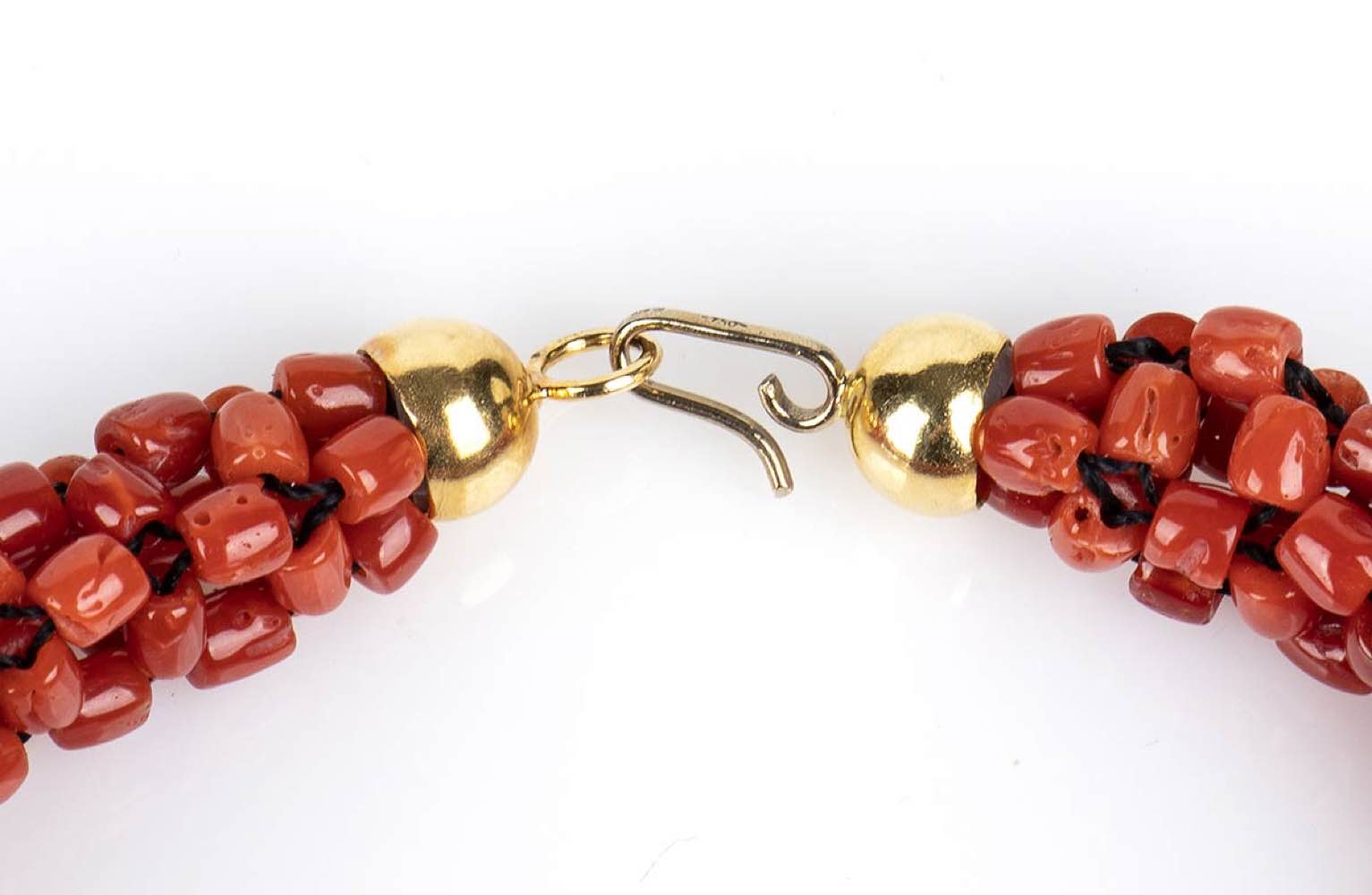 oro 18k, con barilotti di corallo Mediterraneo (corallium rubrum). Punzonato "750" e "1075 NA". Lunghezza 19 cm. Peso 16,7 gr. Stato di conservazione: ***** eccellente.