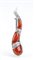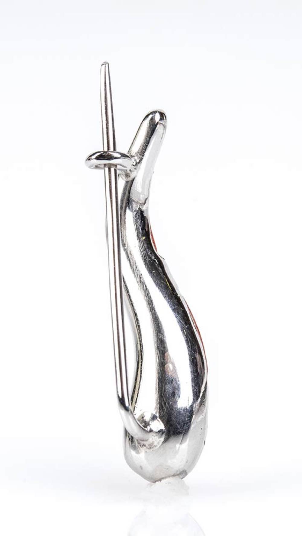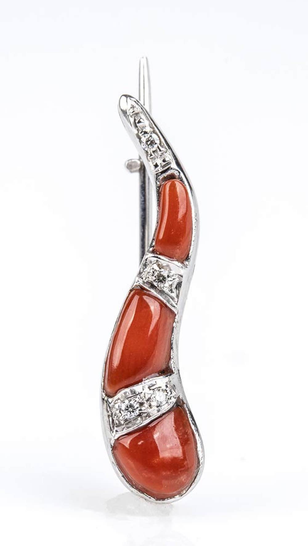 oro bianco 18k, con piccolo corno in corallo Mediterraneo (corallium rubrum) e dettagli in diamanti taglio brillante 0,02 ct circa. Punzonata "750". Lunghezza 20 mm. Peso 1,5 gr. Stato di conservazione: ***** eccellente.