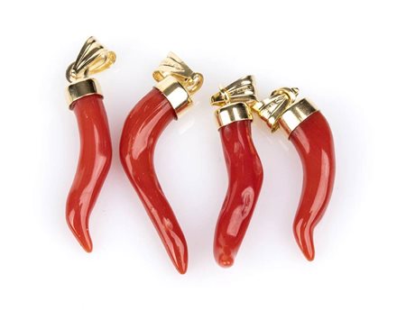oro giallo 18k, incastonati con piccoli corni in corallo Mediterraneo (corallium rubrum). Punzonati "750", "1283 NA". Peso totale 2,8 gr. Stato di conservazione: ***** eccellente.