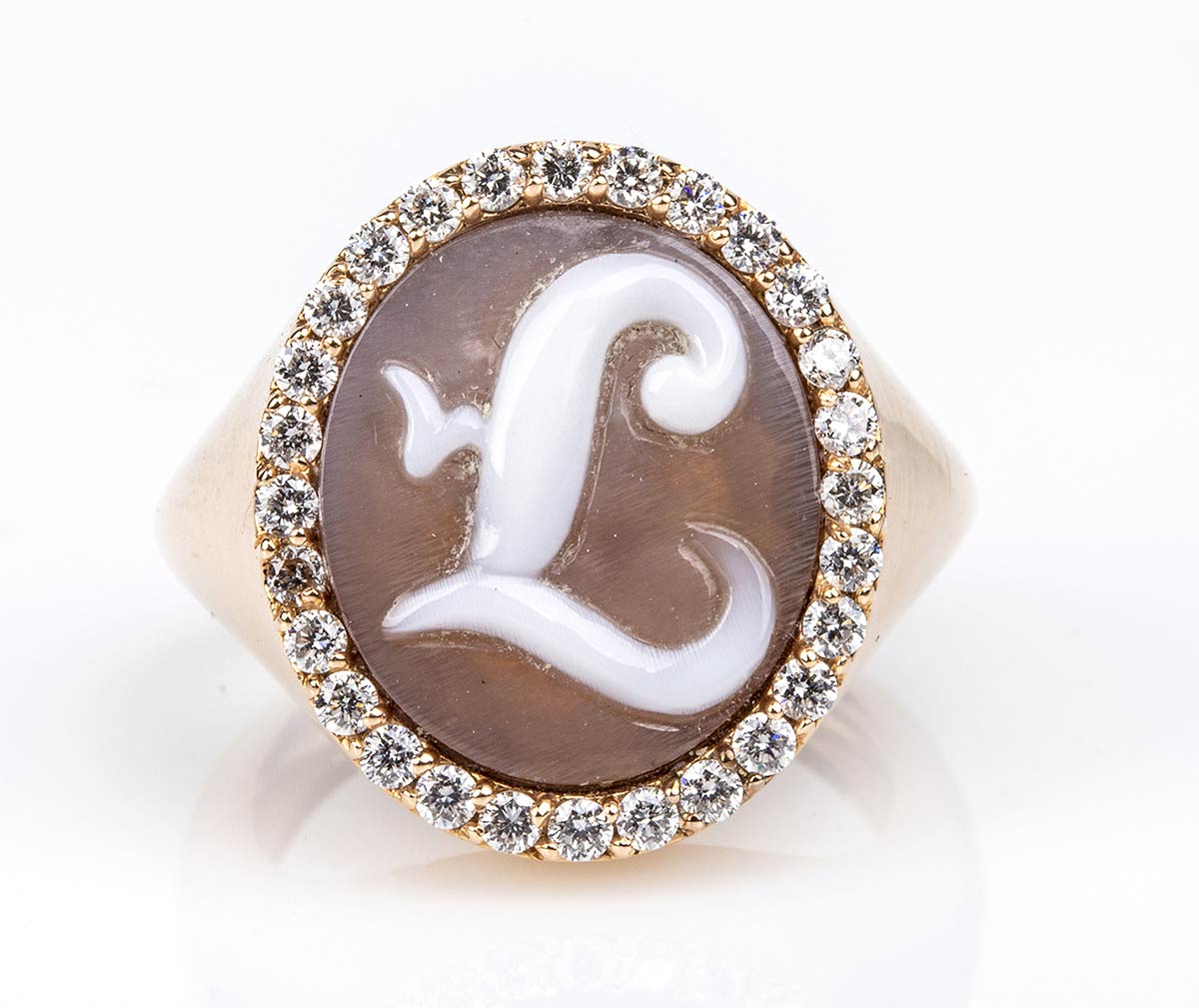 oro bianco 18k, incastonato con cammeo scolpito su conchiglia sardonica raffigurante la lettera "L", incorniciata da diamanti taglio brillante 0,50 ct circa, H, VS. Dimensioni fronte 20 x 15 mm. Peso 6.2 gr. Stato di conservazione: ***** eccellente.