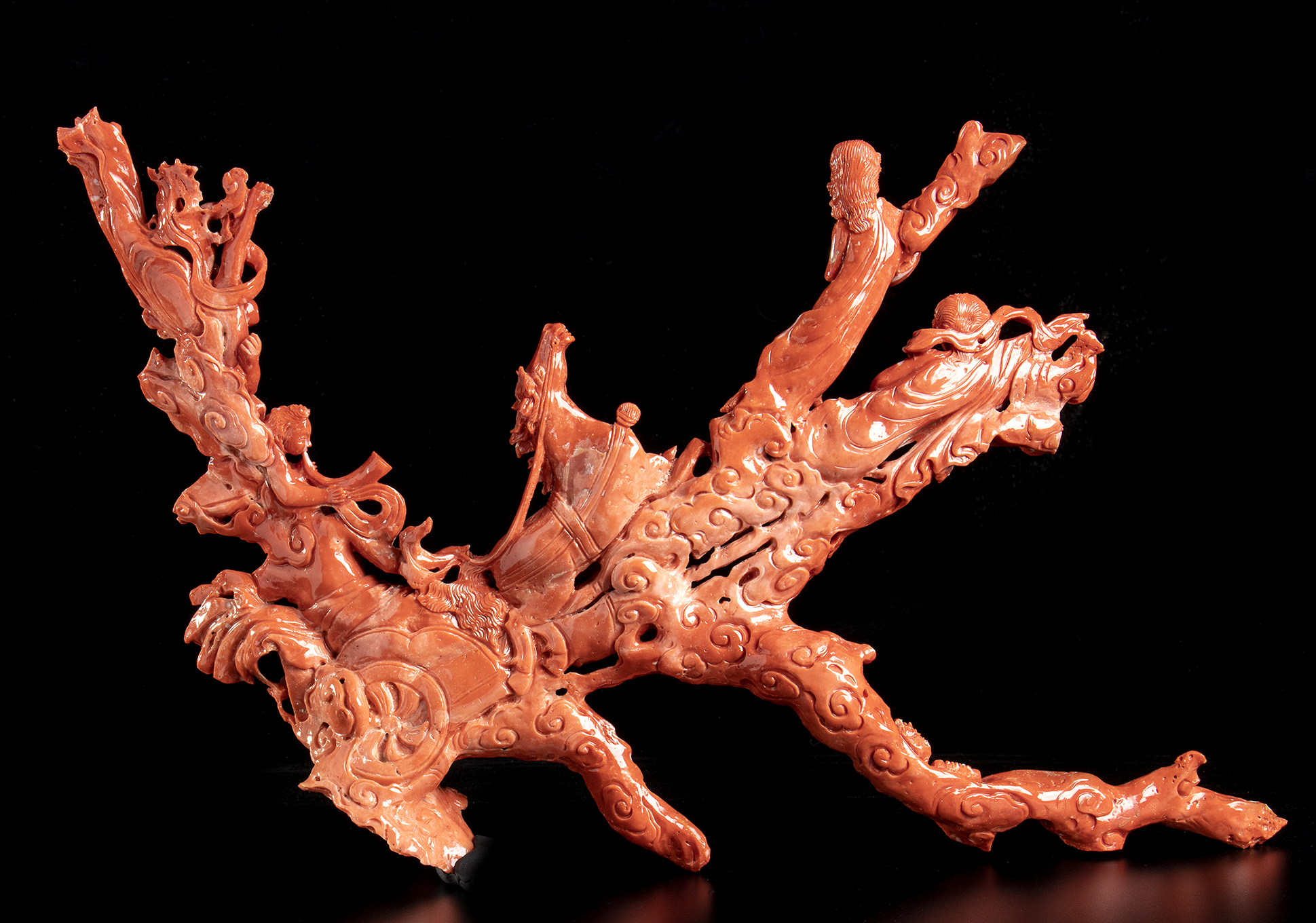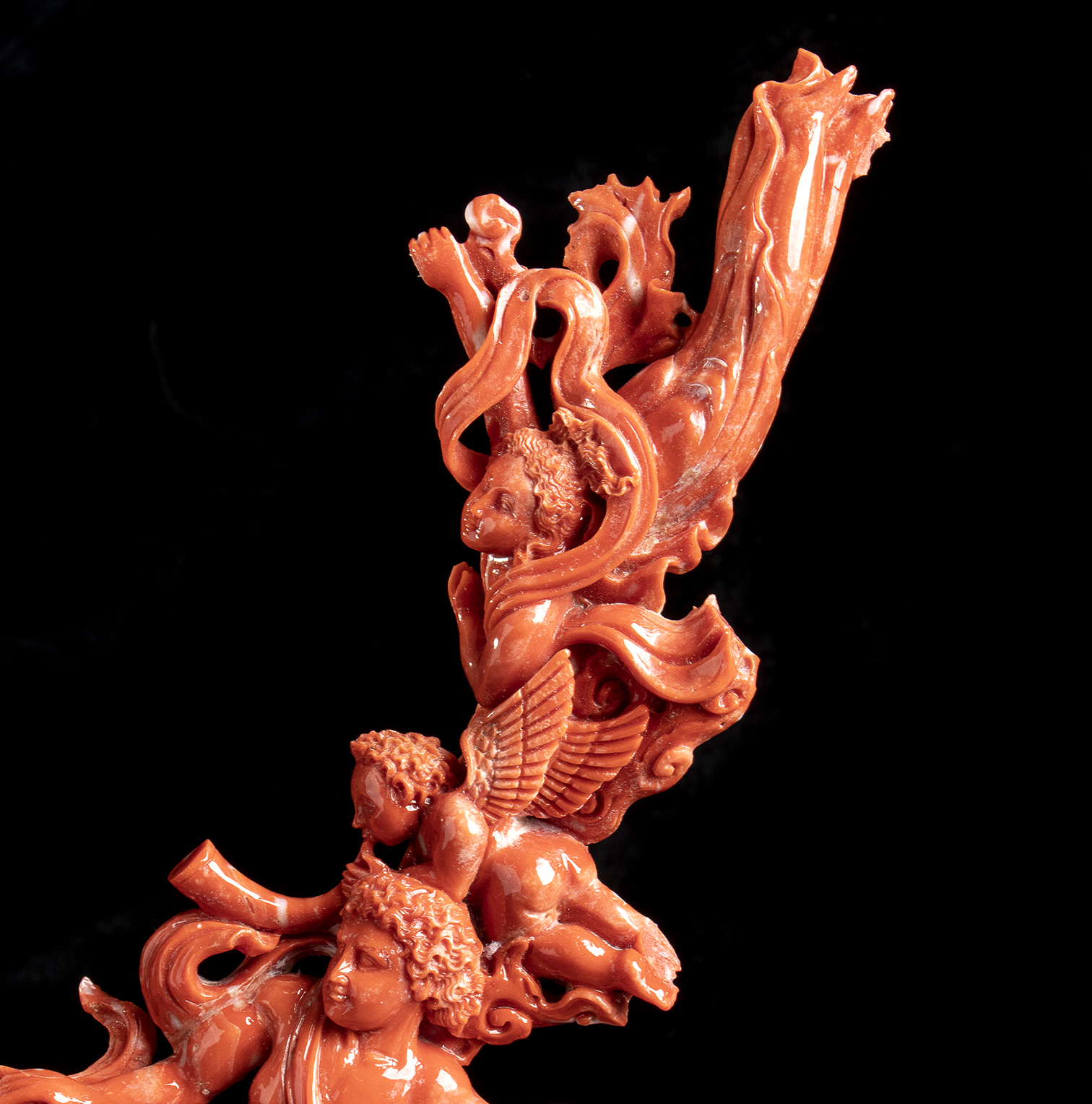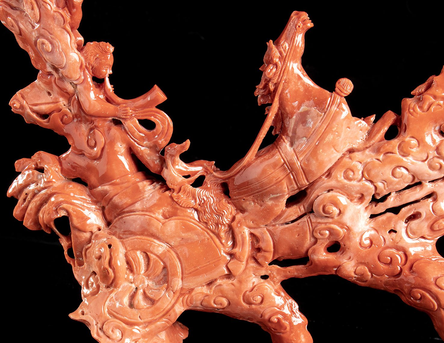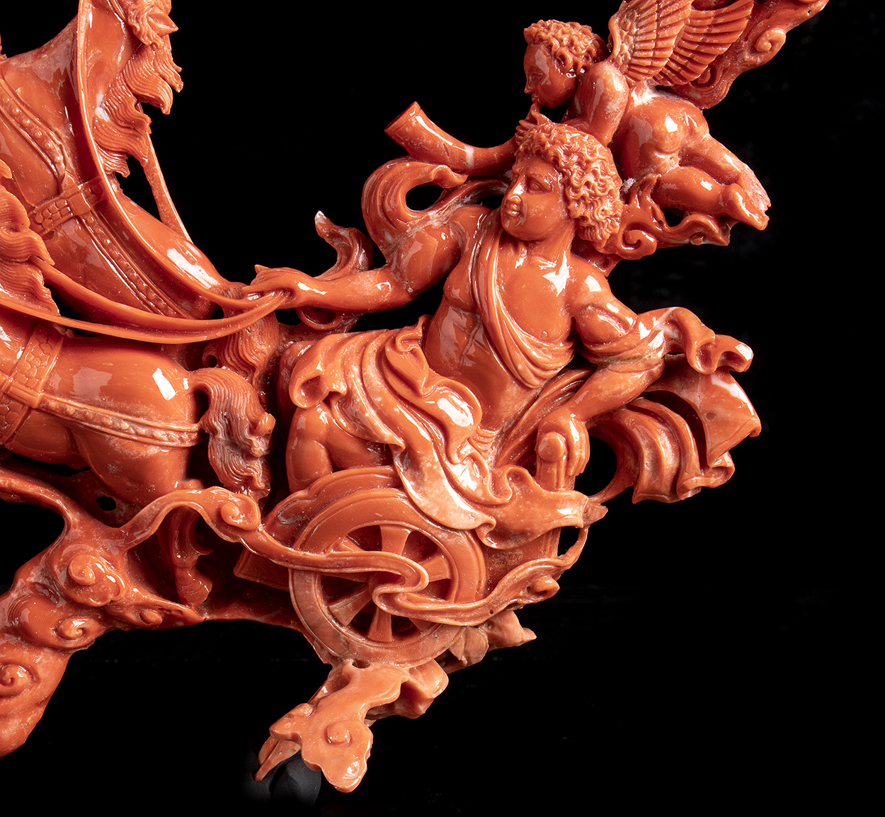 (corallium elatius) raffigurante Apollo mentre guida una biga alata tra i cieli contornato da putti e figure musicanti, rappresentazione tratta dal "mito del carro e dell'auriga" o della biga alata, dal Fedro di Platone. Al verso l'iscrizione "Apollo fly to the sky". Dimensioni 19 x 45 x 3,5 cm. Peso 1029 gr circa. Stato di conservazione: ***** eccellente.