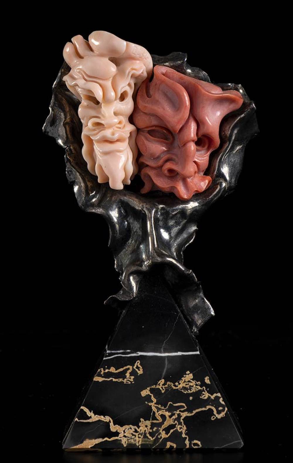 (corallium elatius) raffigurante due volti maschili con montatura in argento 925/1000 e base in marmo. Attribuita ma non firmato a Carlo Parlati, punzonata "925". Altezza 13,5 cm, base 6 x 6 cm. Peso 370,4 gr. Stato di conservazione: ***** eccellente.