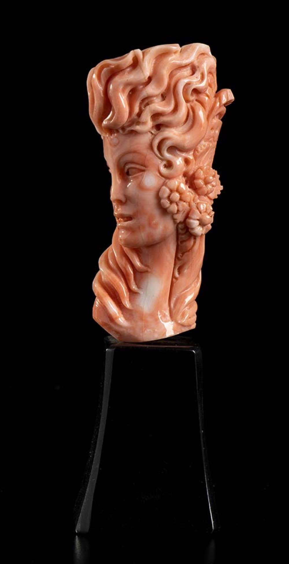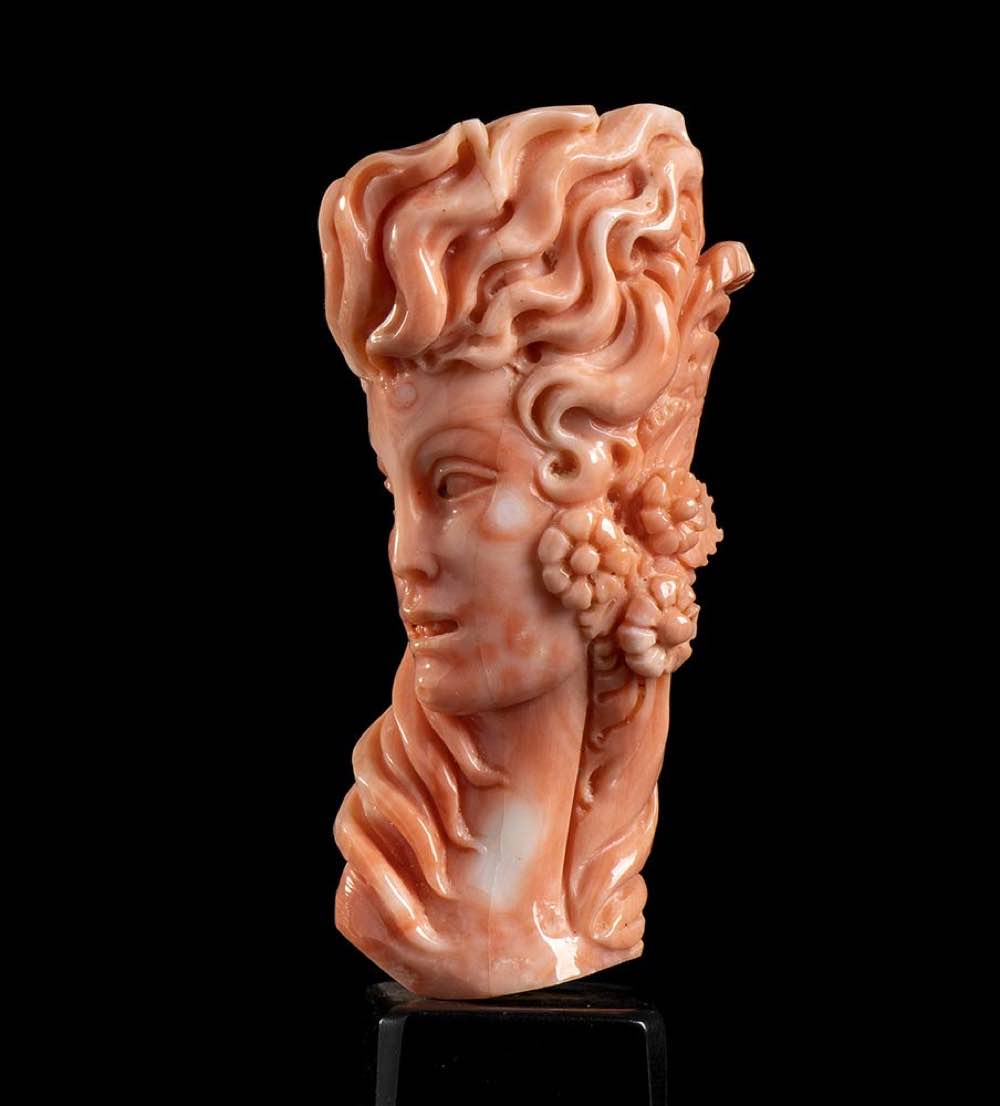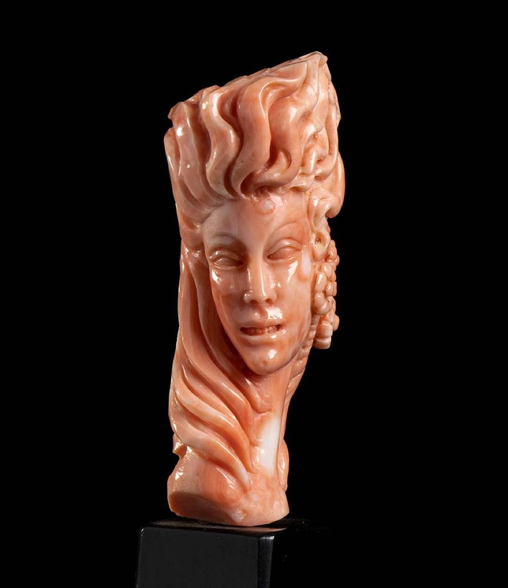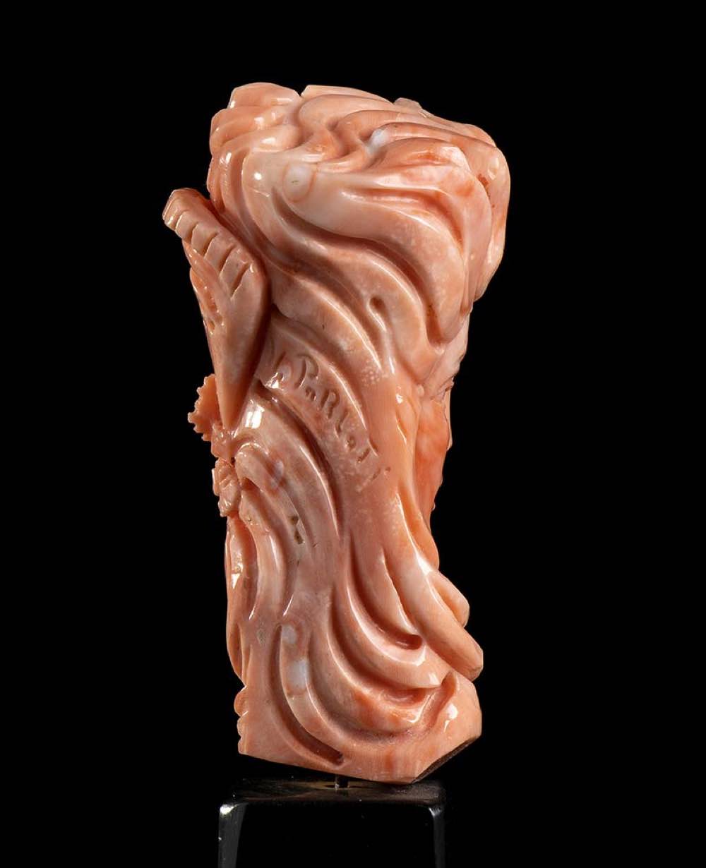 (corallium elatius) raffigurante un volto femminile posto su una base nera in materiale composito. Firmata "Parlati", Carlo Parlati. Dimensioni scultura 7,3 x 3,8 x 2,7 cm, base 4,7 x 3,3 x 3,6 cm. Peso scultura 74,8 gr, peso totale 170,1 gr. Stato di conservazione: ***** eccellente.