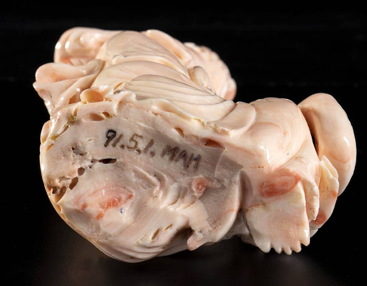 (corallium elatius) raffigurante un Buddha sorridente con un cane di Pho posti su una base lignea. Dimensioni scultura 14,6 x 8 x 4,4 cm, base 3,1 x 12 x 7,5 cm. Peso scultura 429,1 gr. Stato di conservazione: ***** eccellente.