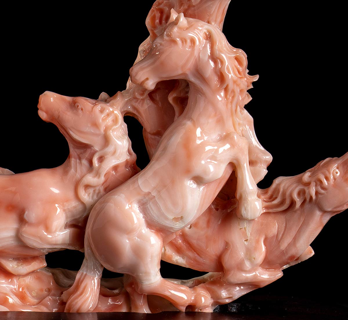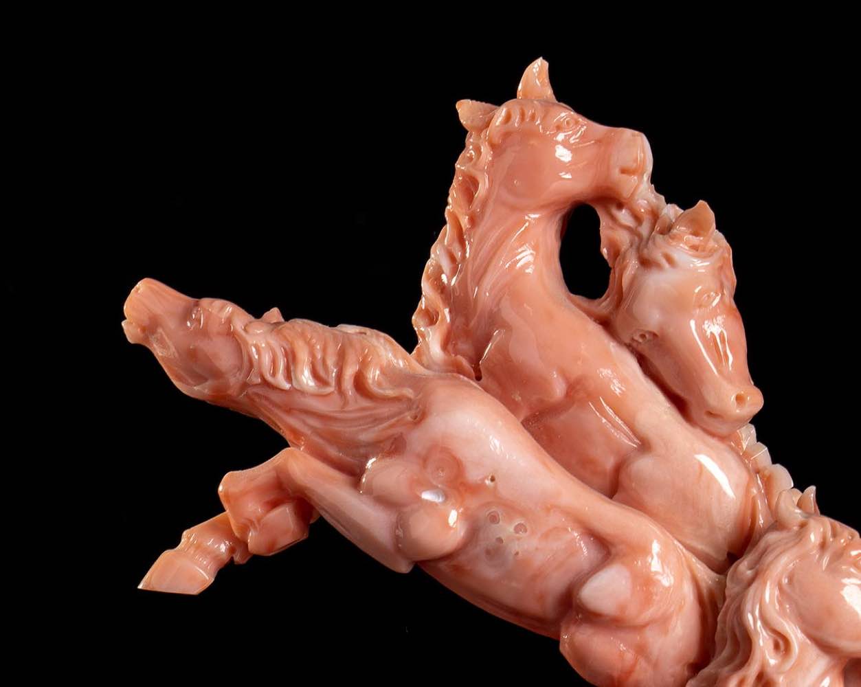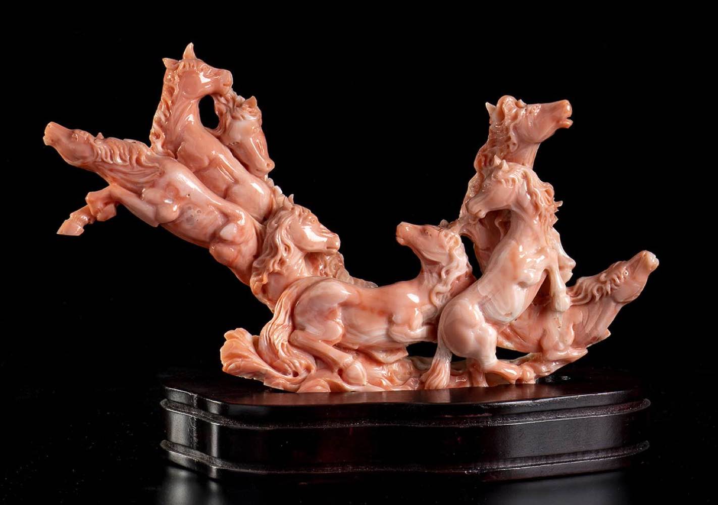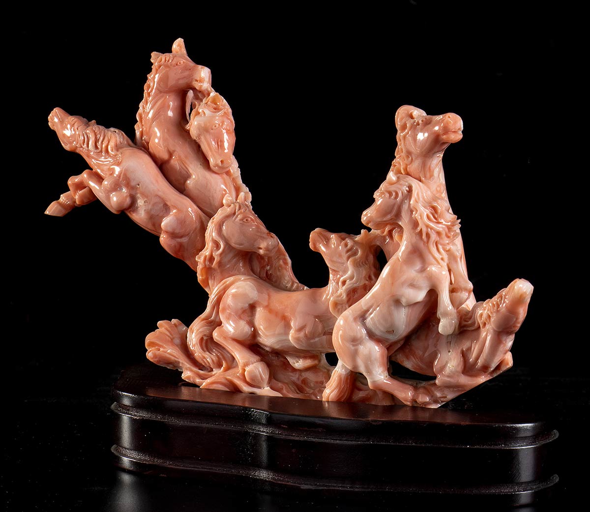 (corallium elatius) raffigurante cavalli posti su una base lignea. Dimensioni scultura 11 x 20,5 x 2,7 cm, base 16 x 7,2 x 2,6 cm. Peso scultura 334,5 gr. Stato di conservazione: ***** eccellente.