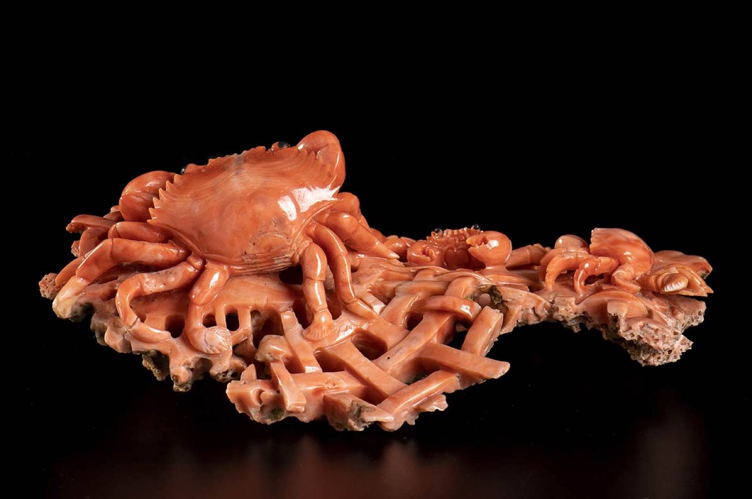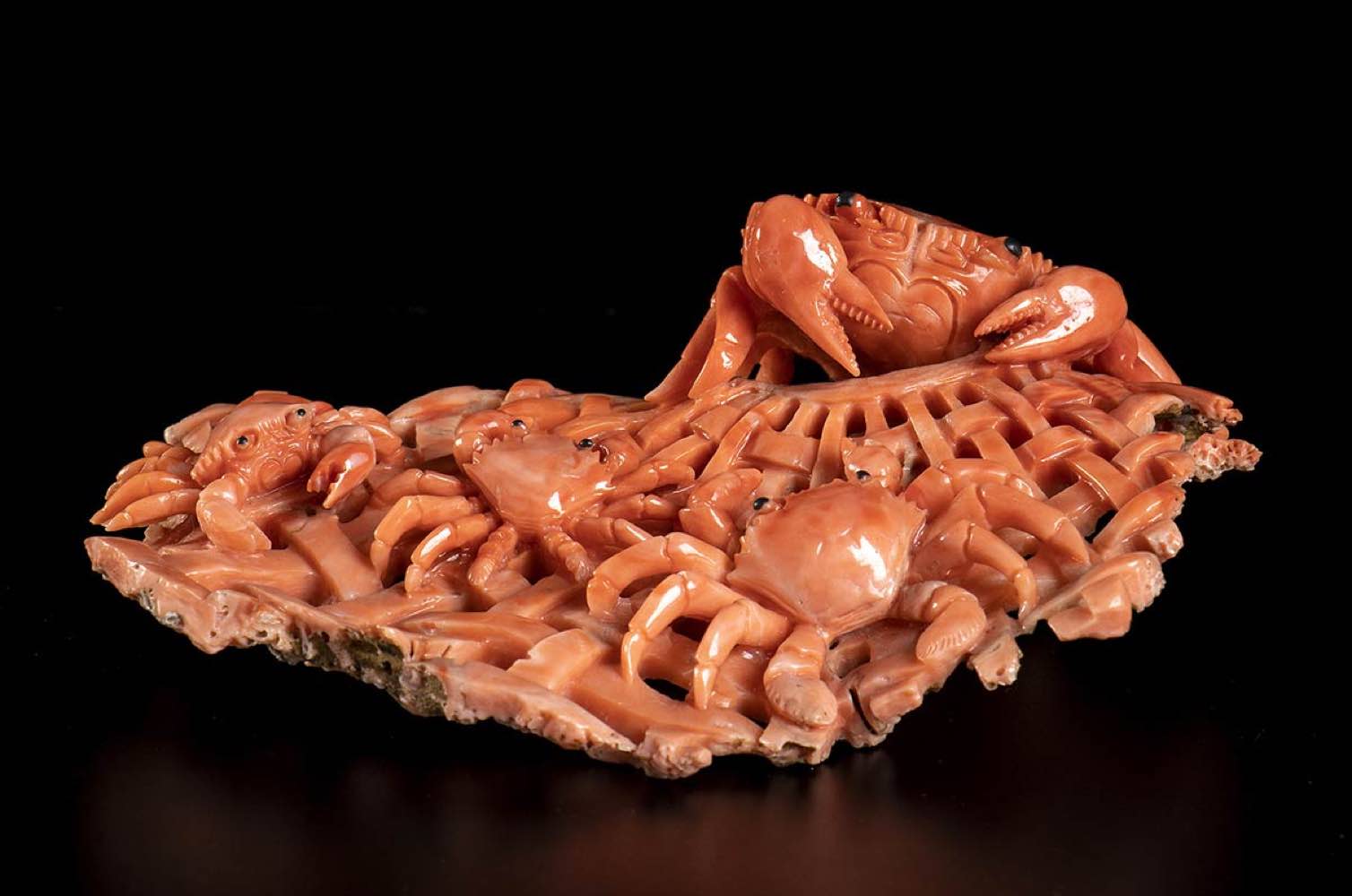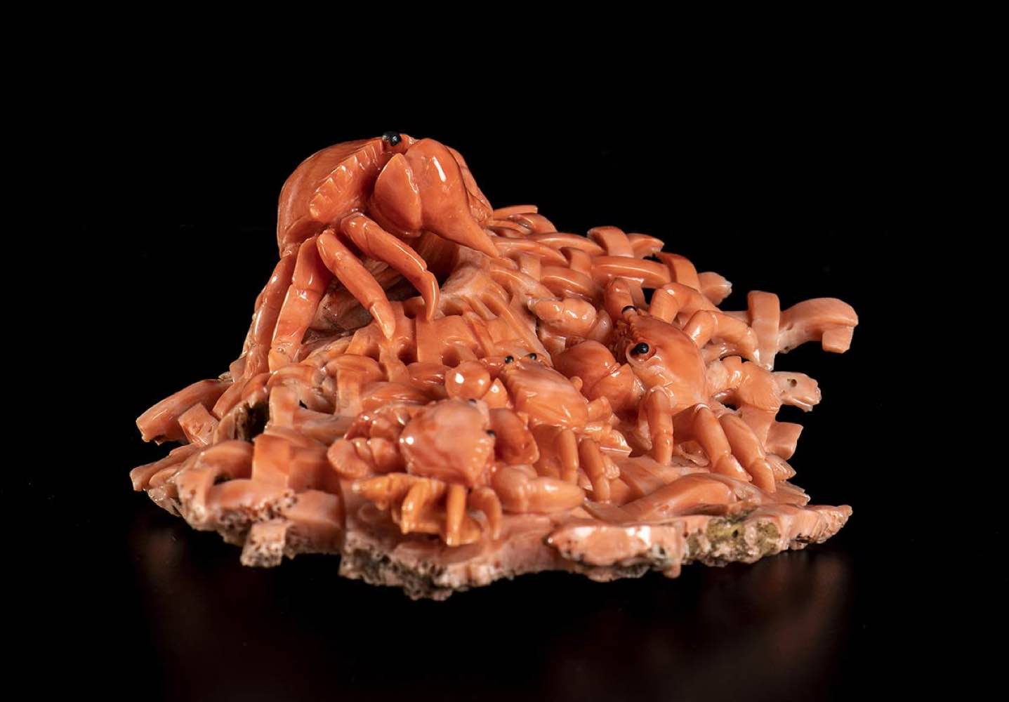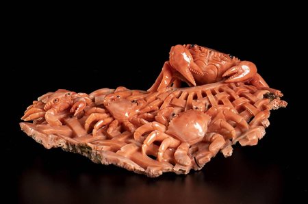 (corallium elatius) raffigurante granchi su una rete da pesca. Dimensioni 5 x 14 x 10 cm. Peso 225,5 gr. Stato di conservazione: ***** eccellente.