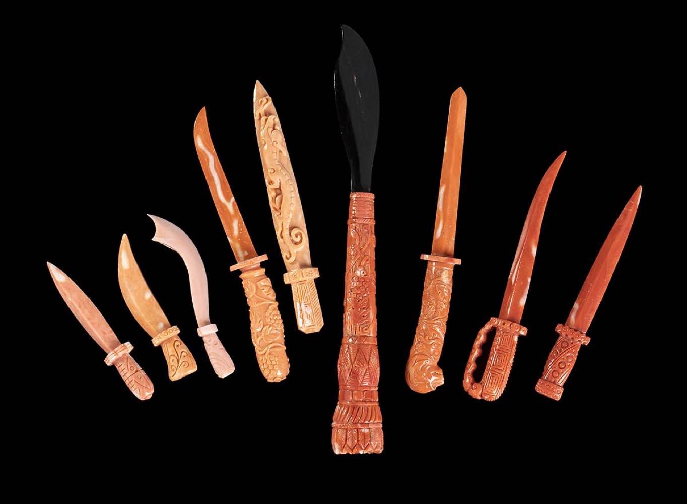 (corallium elatius) raffiguranti pugnali. Dimensioni: 19 x 2,2 x 2 cm (solo manico 11 cm, lama plastica); 13,5 x 1,7 x 1,2 cm; 11,4 x 1,5 x 1,2 cm; 11,5 x 2 x 1,2 cm; 10,2 x 1,5 x 1 cm; 12,5 x 1,4 x 1,1 cm; 7,5 x 1,2 x 1,2 cm; 7,8 x 1,5 x 0,8 cm; 7 x 1,2 x 1,1 cm. Peso complessivo 153,2 gr. Stato di conservazione: ***** eccellente.