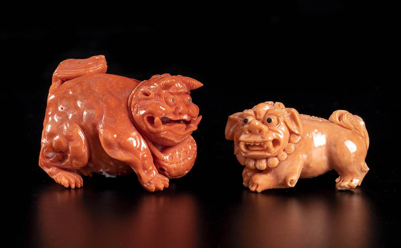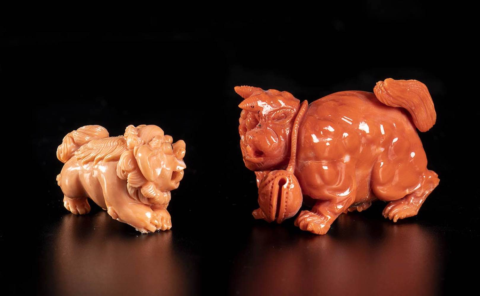 (corallium elatius) raffiguranti due cani Pho. Dimensioni 3,7 x 5,8 x 2,8 cm; 2,6 x 4,2 x 2 cm. Pesi 62,7 gr e 26,7 gr. Stato di conservazione: ***** eccellente.