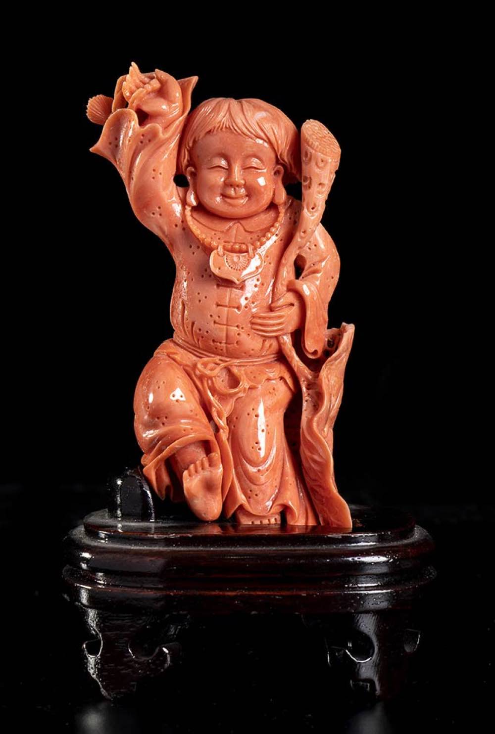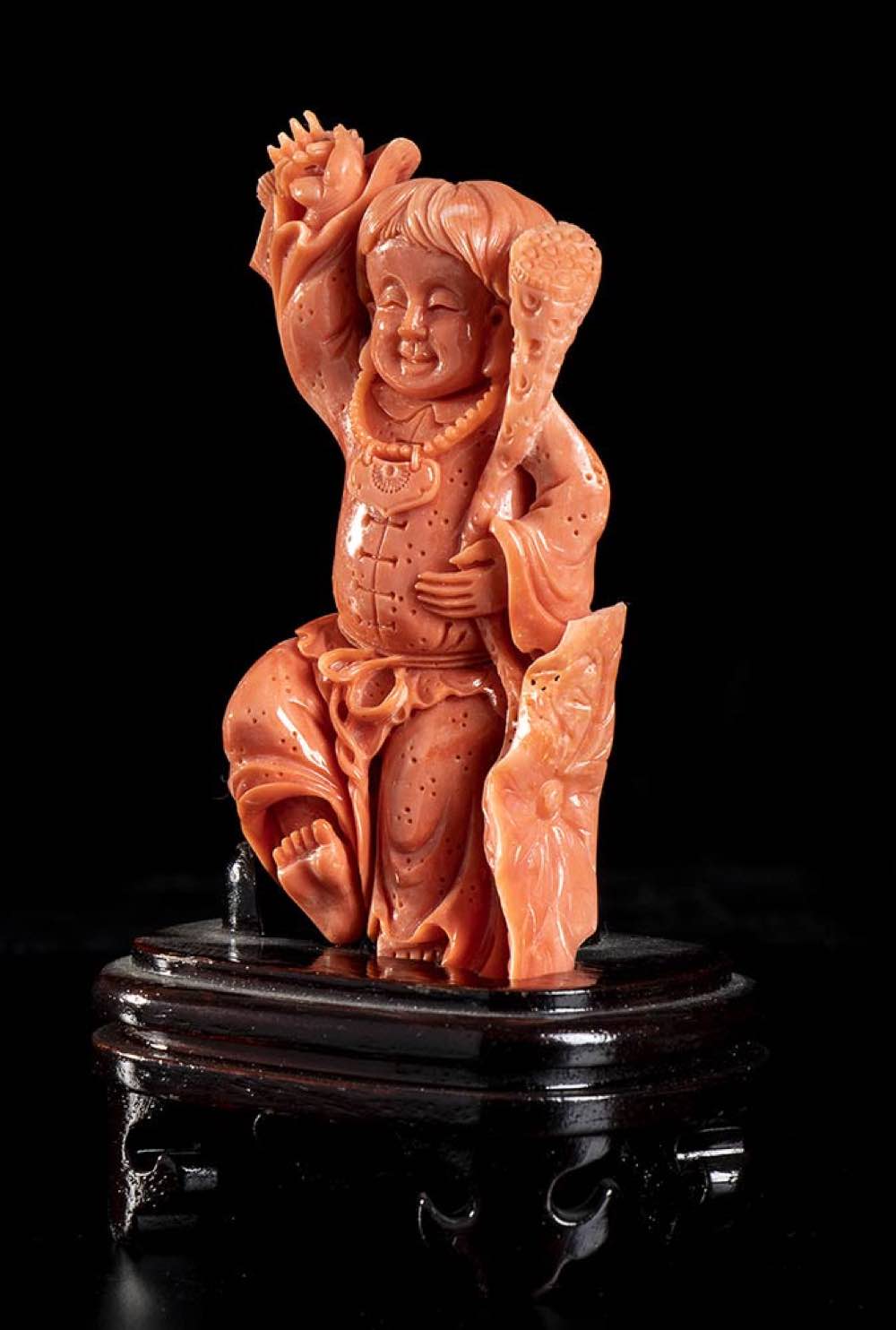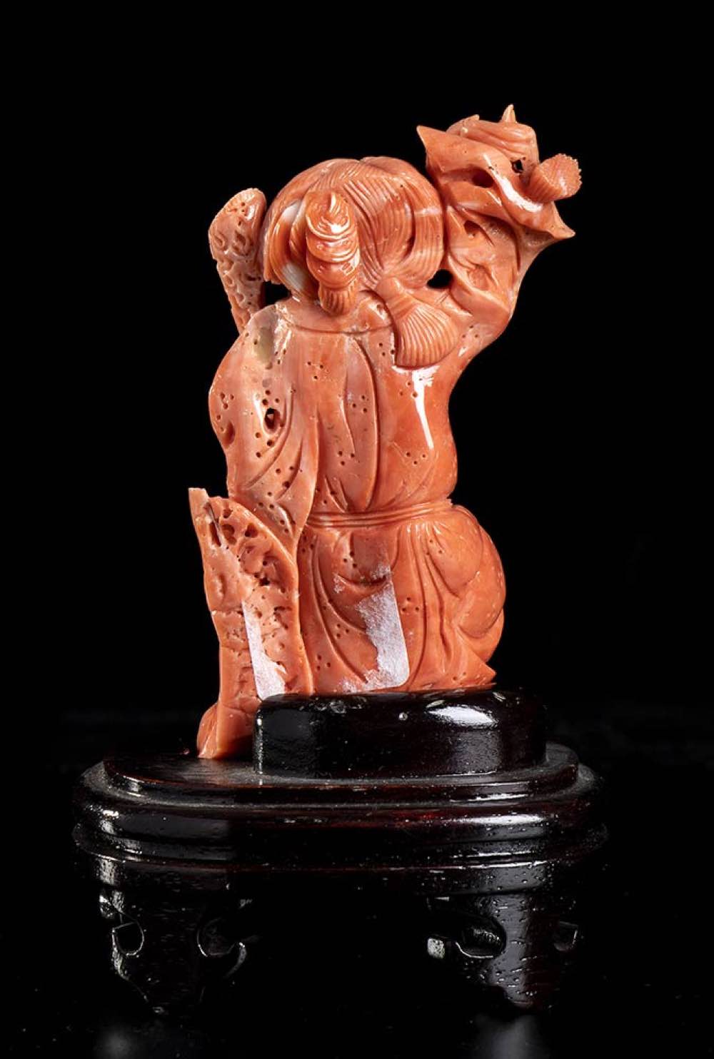 (corallium elatius) raffigurante una figura femminile posta su una base lignea. Dimensioni scultura 10 x 4,9 x 2,7 cm, base 3,2 x 7,3 x 5,5 cm. Peso scultura 95,5 gr. Stato di conservazione: ***** eccellente.