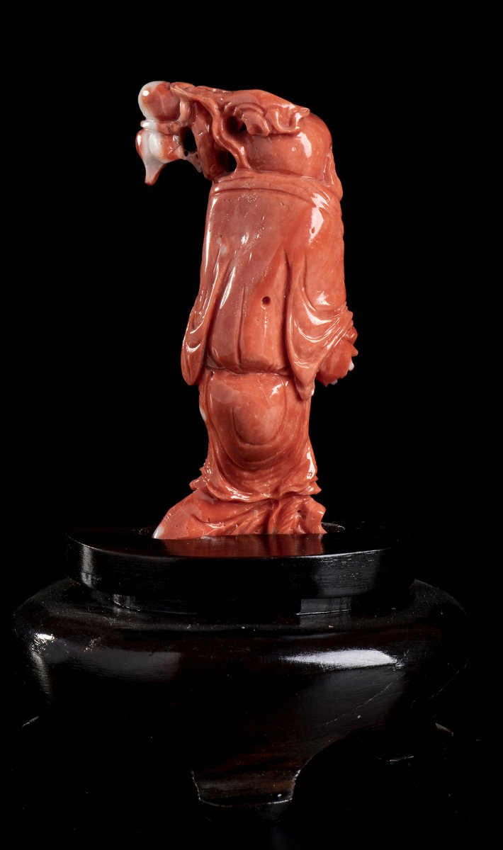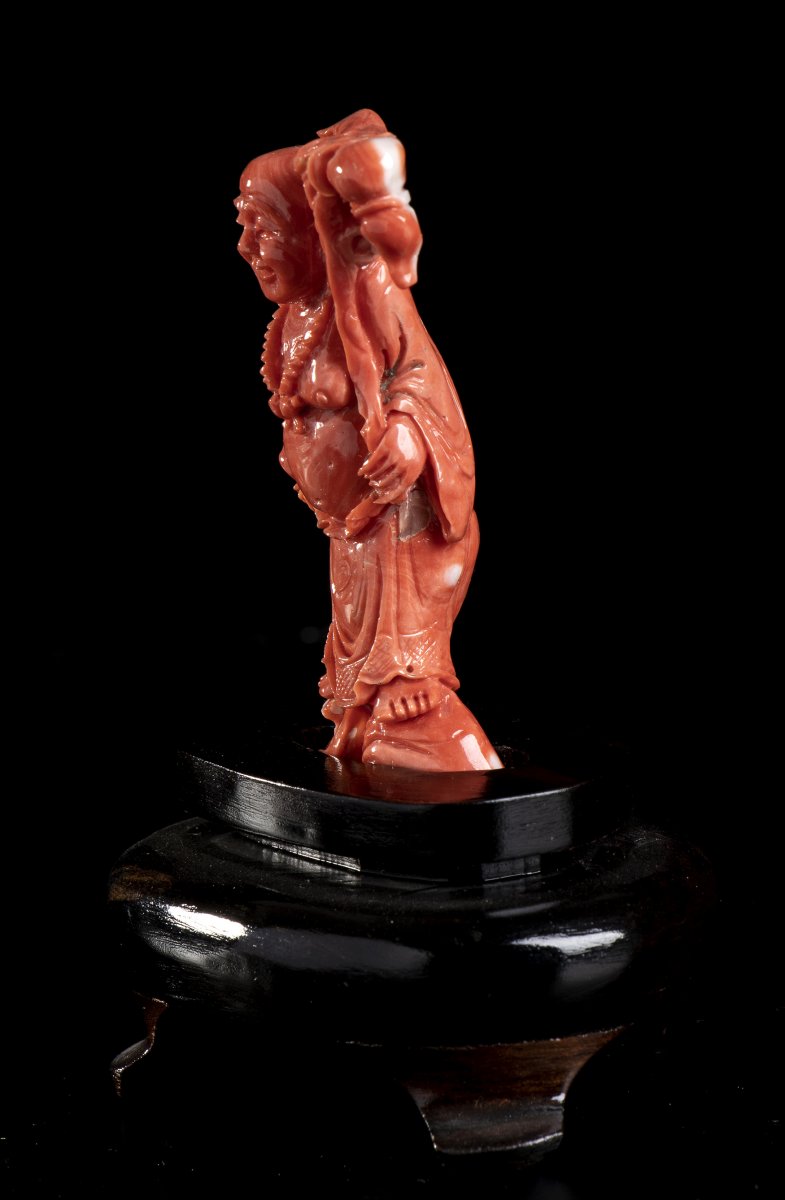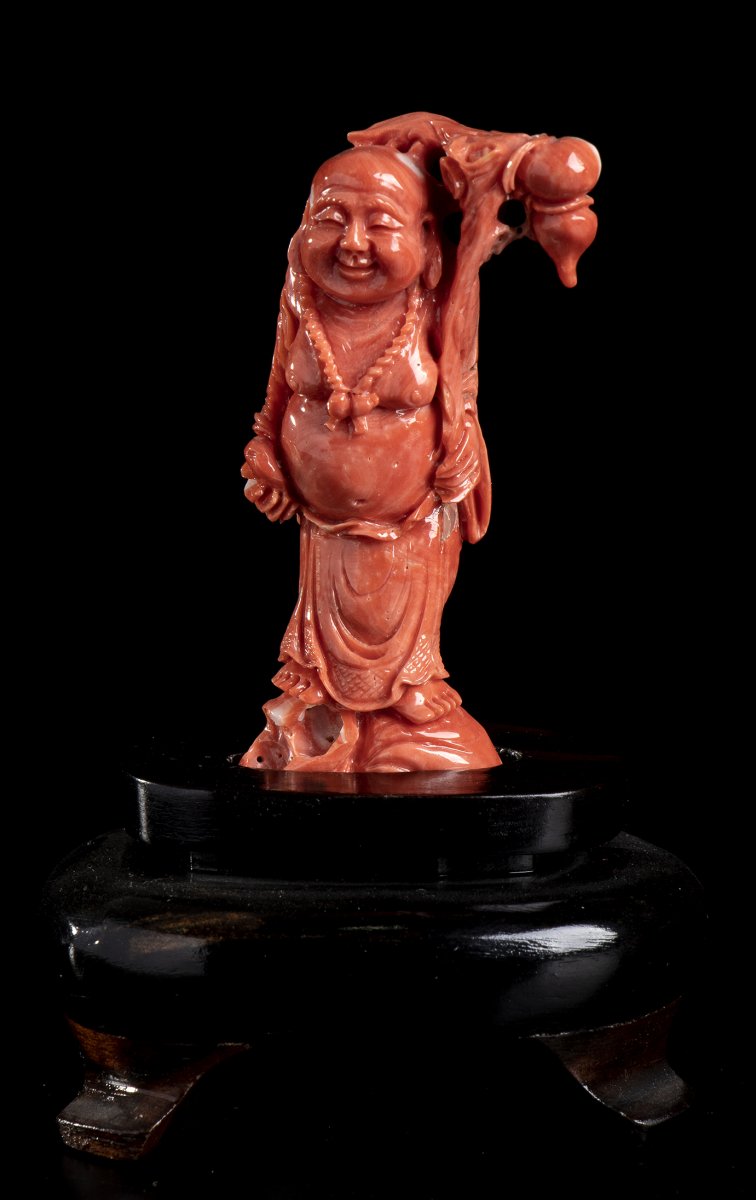 (corallium elatius) raffigurante un Buddha posto sopra una base lignea. Dimensioni scultura 6,3 x 2,9 x 1,7 cm, base 3,4 x 6,1 x 4,7 cm. Peso scultura 26 gr. Stato di conservazione: ***** eccellente.