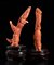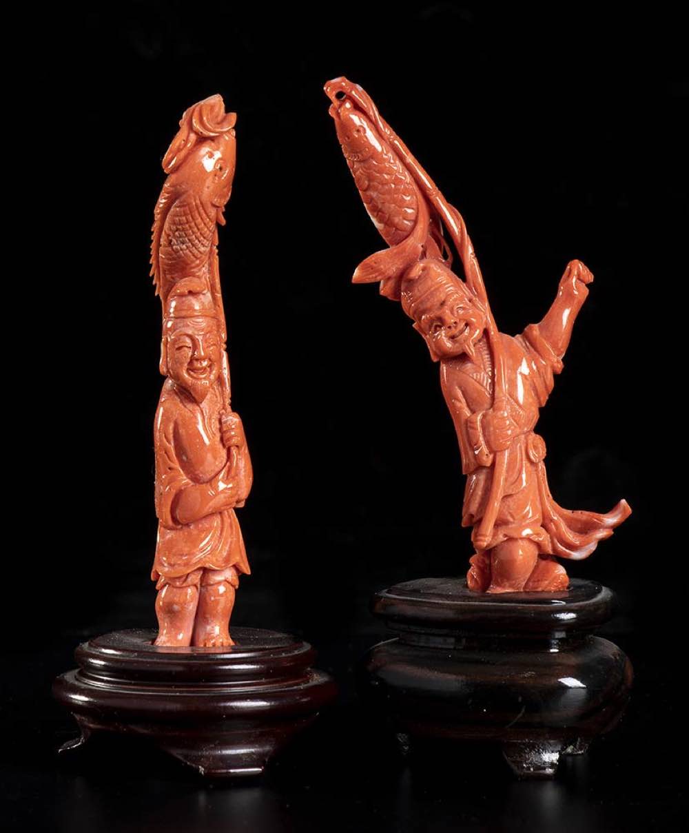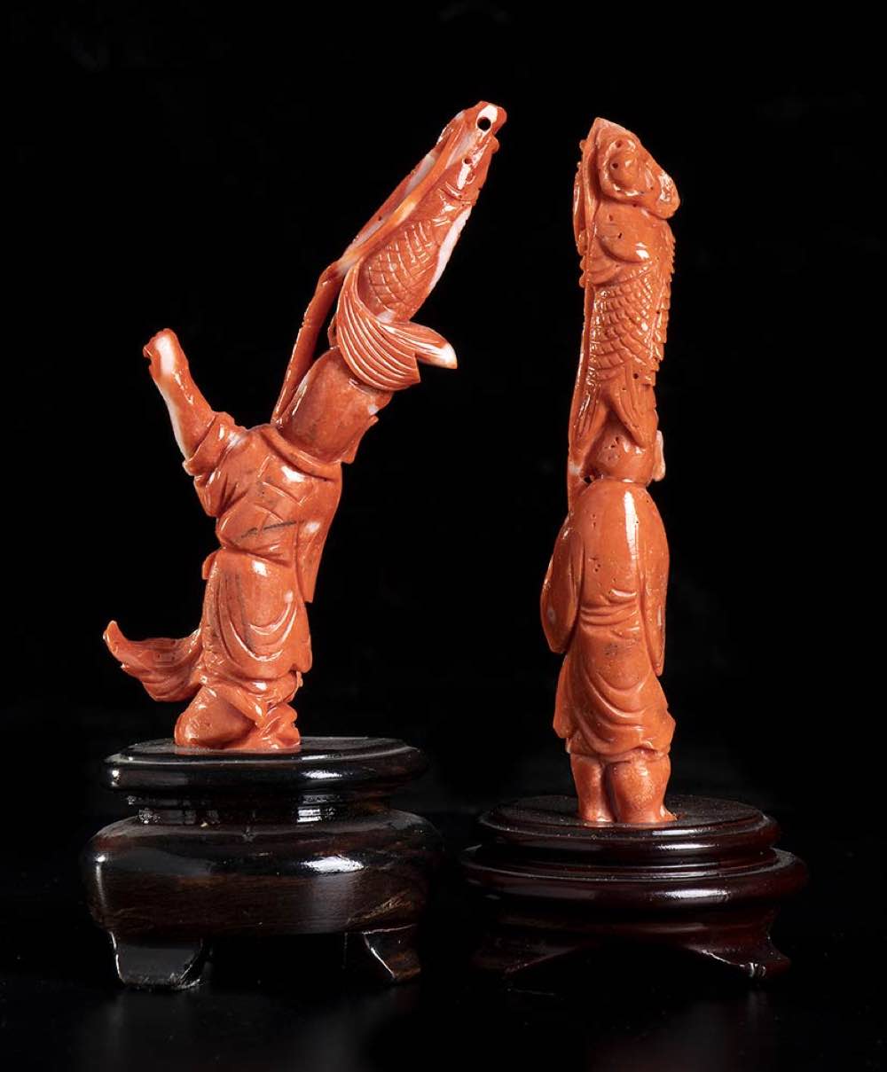 (corallium elatius) raffigurante una coppia di pescatori con canna da pesca e carpa posti su basi lignee. Dimensioni: 10 x 1,6 x 1,5 cm, diametro base 5,1 cm, altezza 2,2 cm; 10 x 3,2 x 1,8 cm, base 3,2 x 5,2 x 4 cm. Pesi sculture 31,5 gr e 33,2 gr. Stato di conservazione: ***** eccellente.