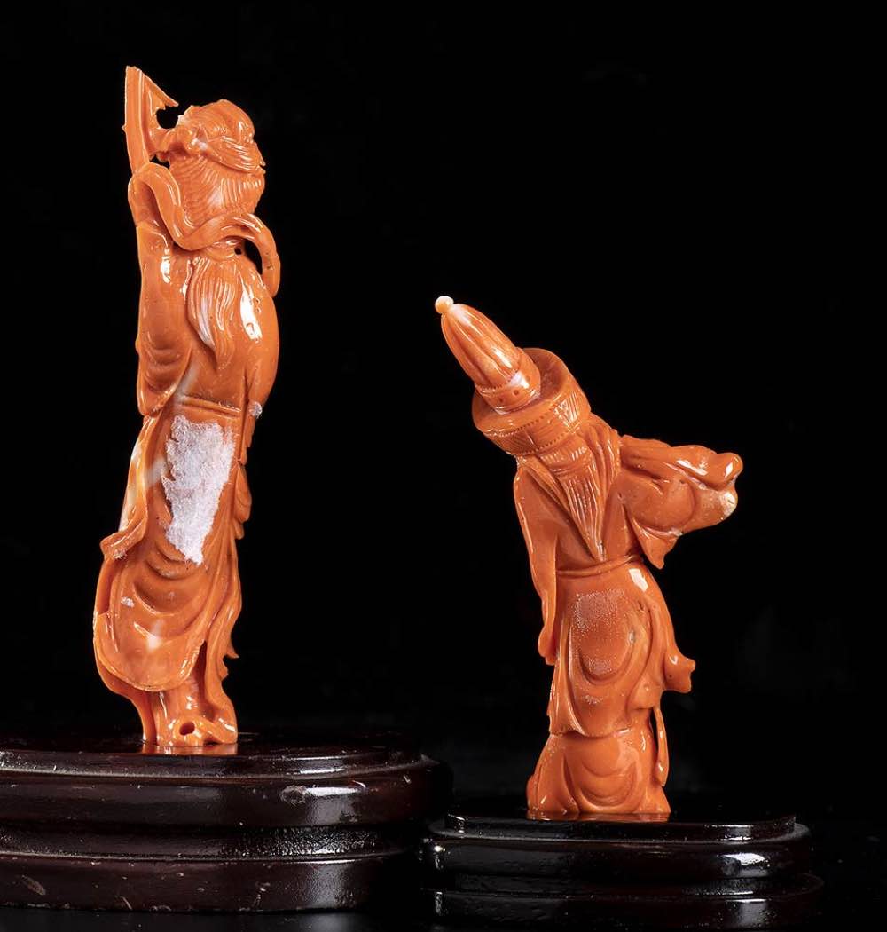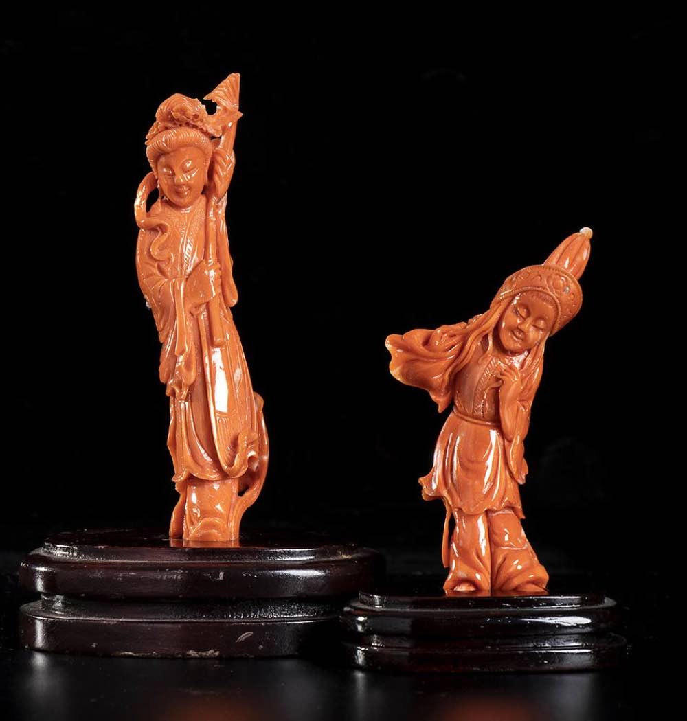 (corallium elatius) raffiguranti due figure femminili poste su basi lignee. Dimensioni: 11,1 x 2,1 x 1,8 cm, base 2,2 x 7,9 x 5,9 cm; 7,9 x 4 x 1,7 cm, base 1,5 x 5,9 x 4,3 cm. Pesi sculture 44,3 gr e 29,5 gr. Stato di conservazione: ***** eccellente.