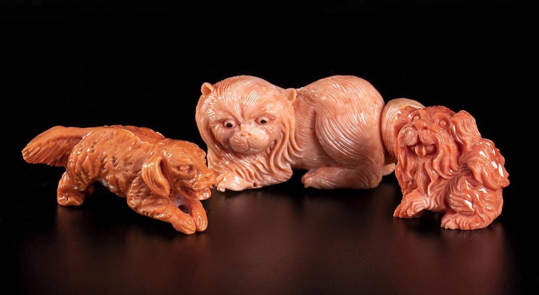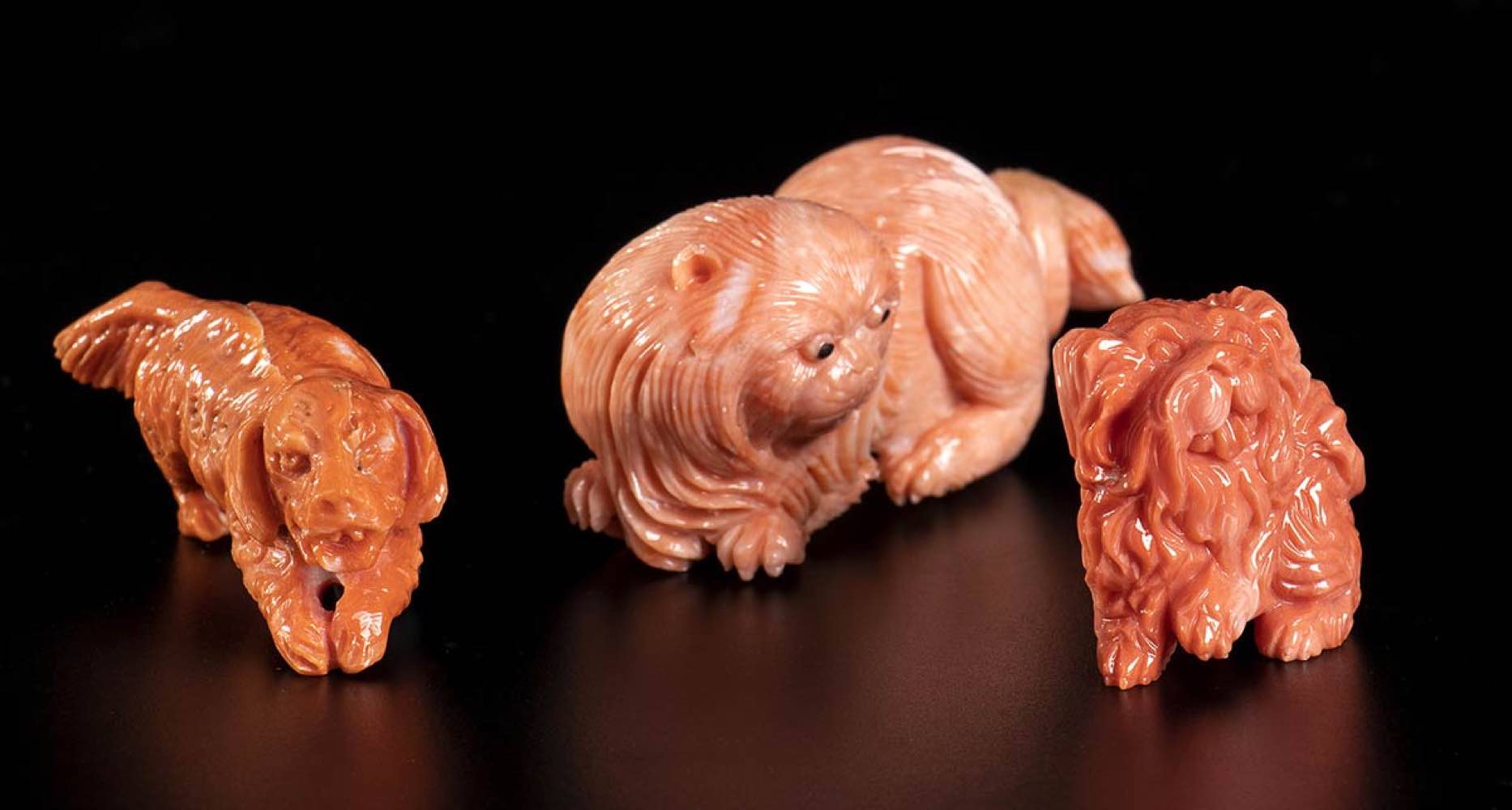 (corallium elatius) raffiguranti un gatto e due cani. Dimensioni 3 x 6,2 x 2,7 cm; 2,3 x 5,2 x 1,7 cm; 2,8 x 3 x 1,6 cm. Pesi 63 gr, 19,5 gr e 19,5 gr. Stato di conservazione: ***** eccellente.