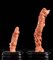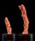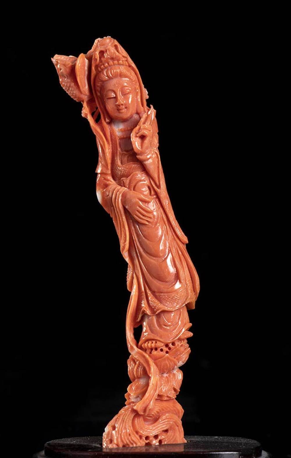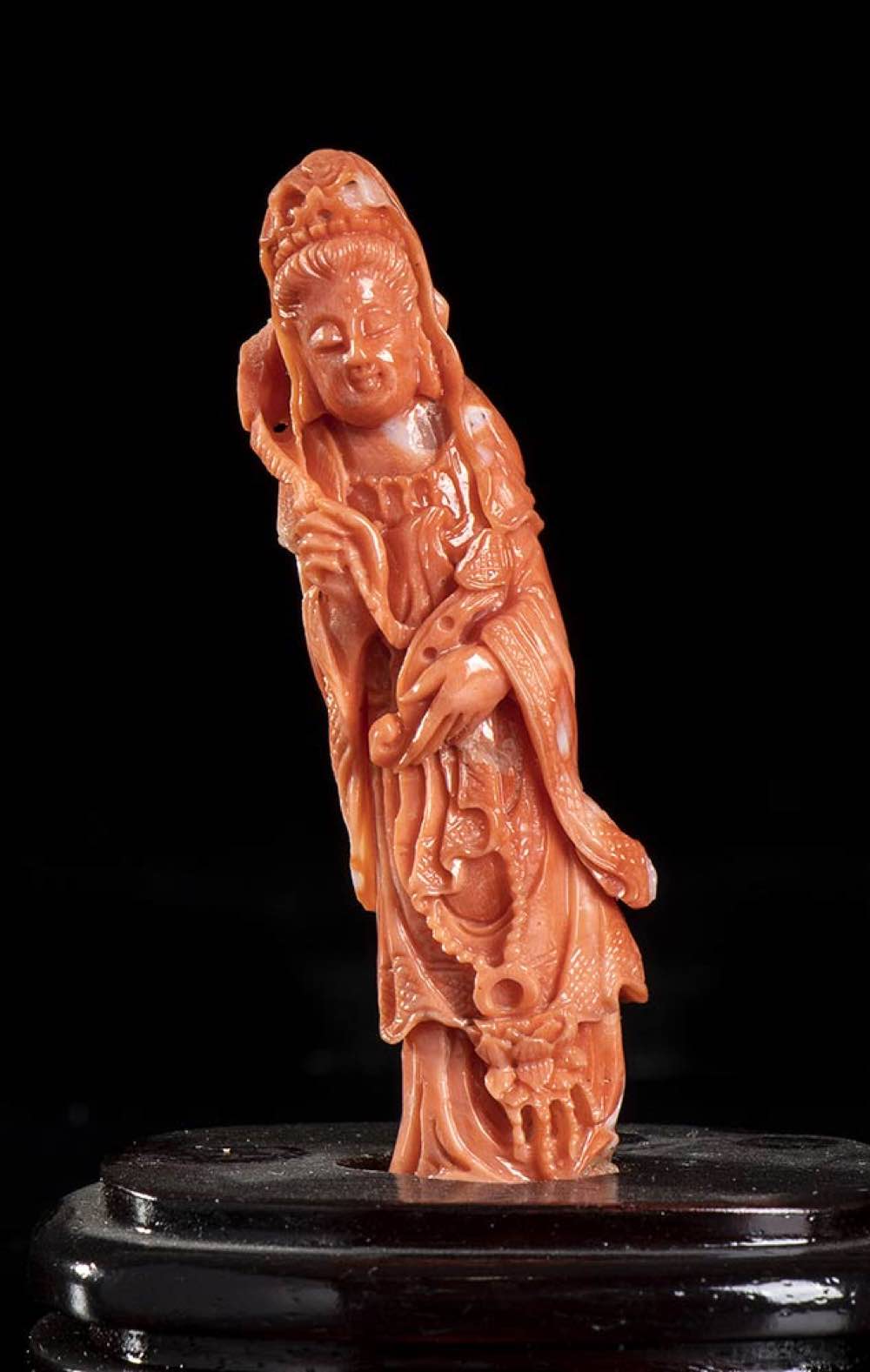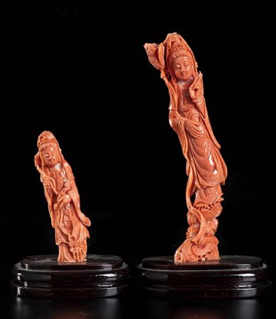(corallium elatius) raffiguranti Geishe poste su basi lignee. Dimensioni: 11,3 x 2,5 x 1,3 cm, base 1,5 x 6,4 x 4,2 cm; 6,5 x 1,8 x 1,3 cm, base 1,5 x 5,6 x 4,3. Pesi sculture 38,1 gr e 17,8 gr. Stato di conservazione: ***** eccellente.
