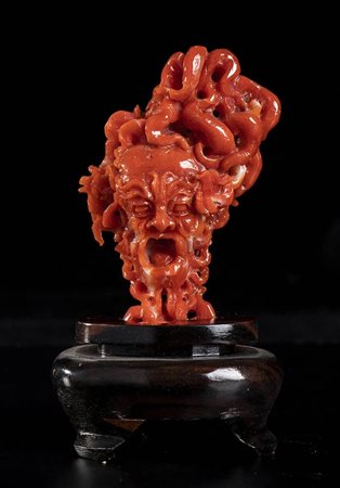 (corallium elatius) raffigurante una maschera posta su una base lignea. Dimensioni scultura 7,3 x 4,5 x 2,3 cm, base 3,2 x 5,5 x 4,4 cm. Peso scultura 48 gr. Stato di conservazione: ***** eccellente.