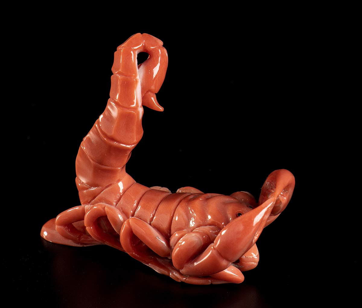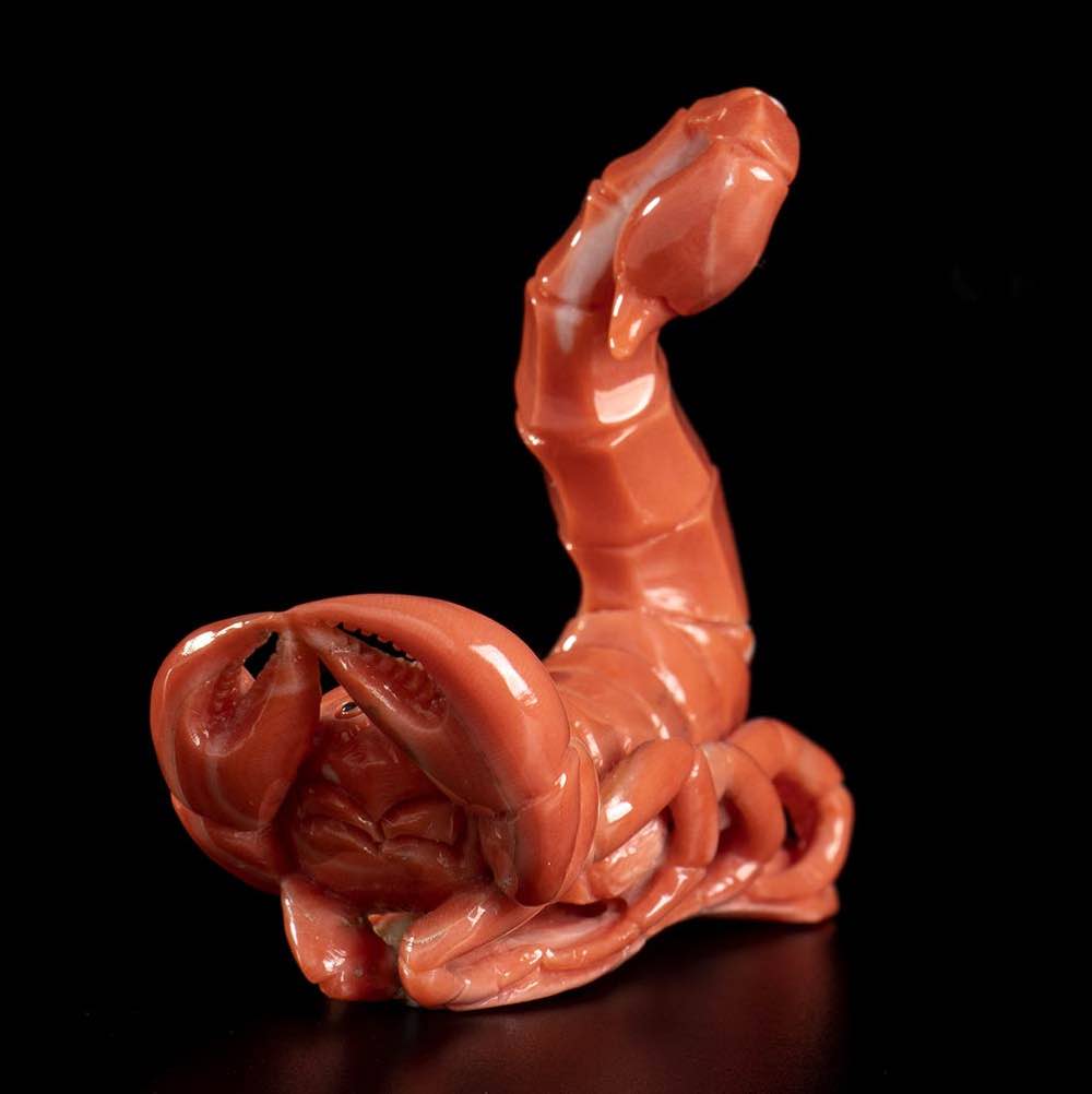 corallo Cerasuolo (Corallium Elatius) raffigurante uno scorpione posto sopra una base in materiale composito. Dimensioni scultura 5,5 x 5,9 x 2,6 cm, base 1,5 x 6,5 x 3,8 cm. Peso scultura 29,1 gr. Stato di conservazione: ***** eccellente.