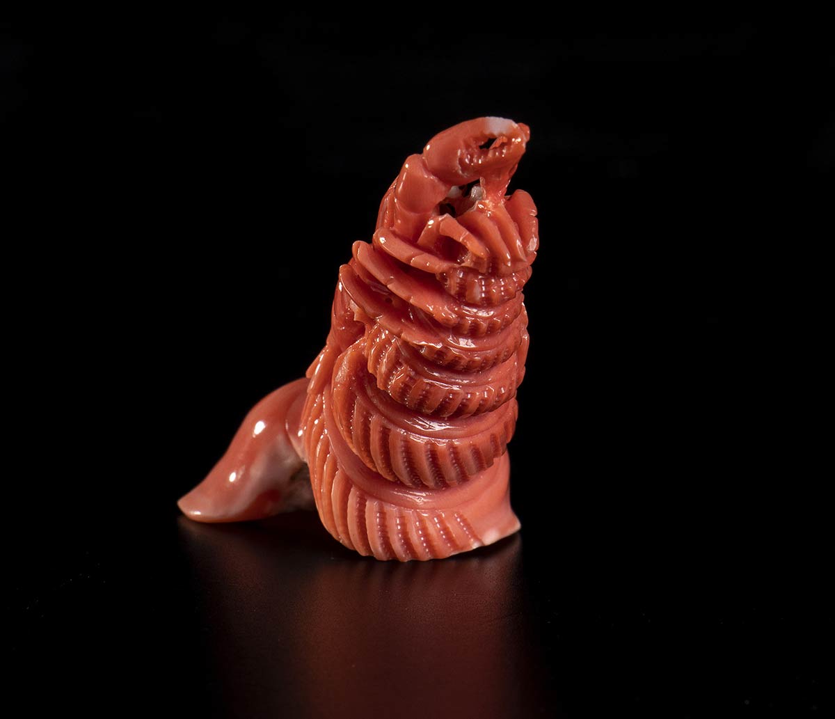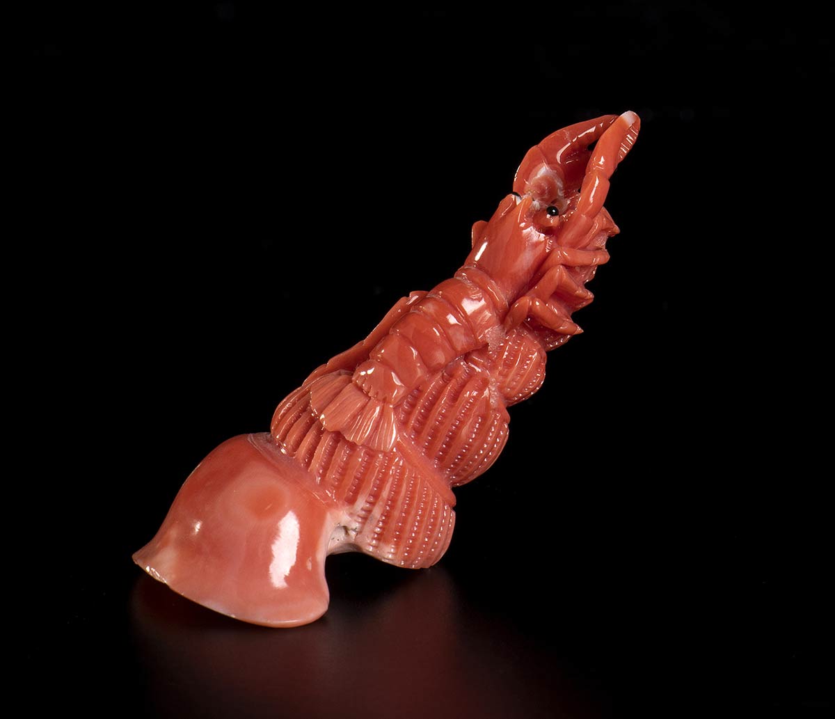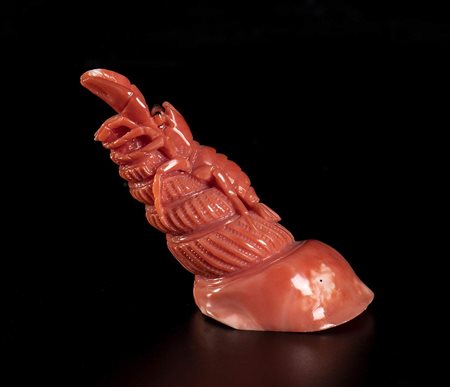 (corallium elatius) raffigurante un astice posto su una conchiglia. Dimensioni 5,8 x 2,6 x 2,3 cm. Peso 19 gr. Stato di conservazione: ***** eccellente.