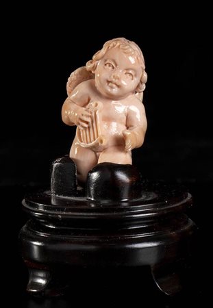 (corallium elatius) raffigurante un putto posto su una base lignea. Dimensioni scultura 4,3 x 2,2 x 2 cm, altezza base 2,3 cm, diametro 4,5 cm. Peso scultura 19,5 gr. Stato di conservazione: ***** eccellente.