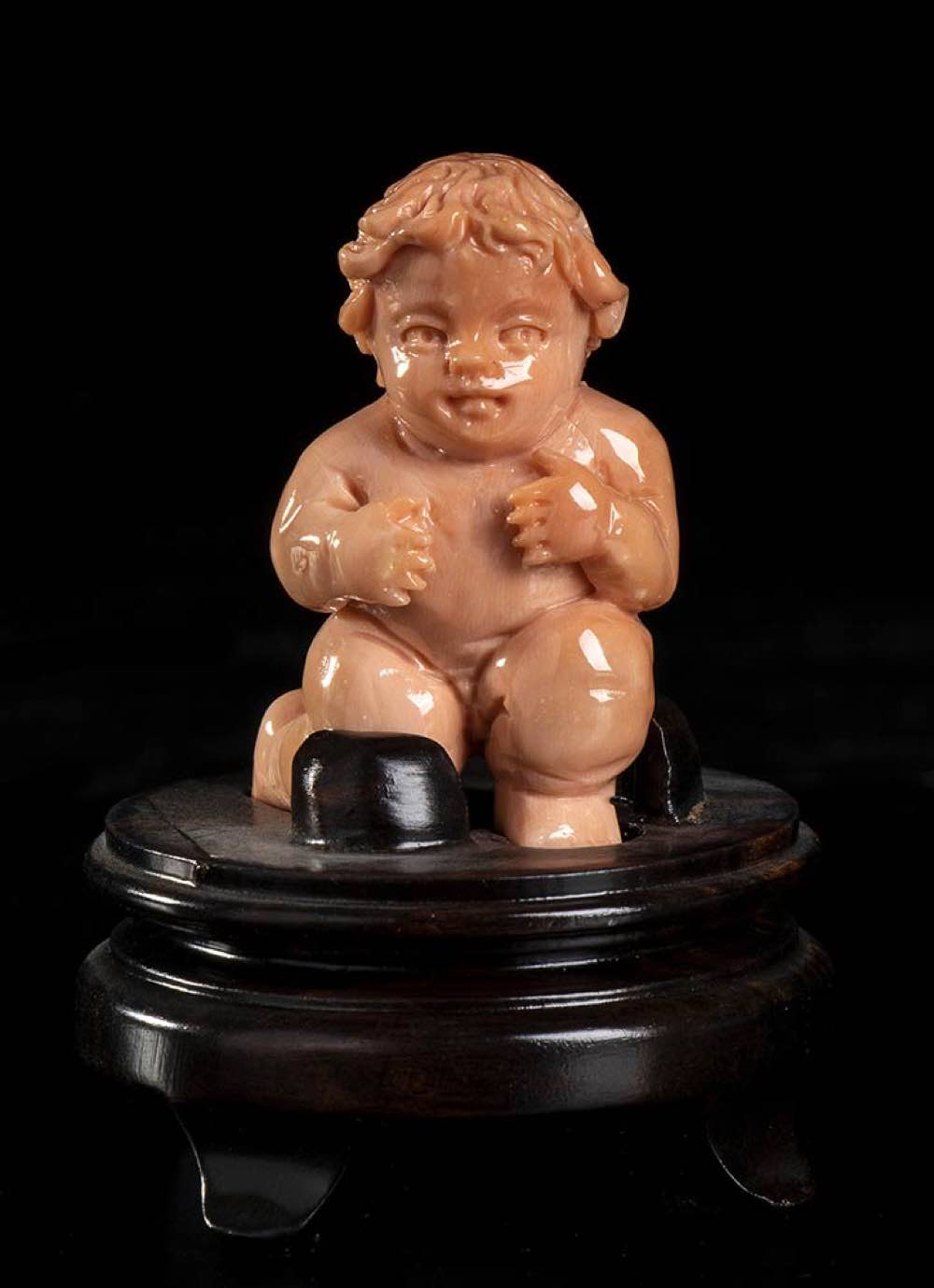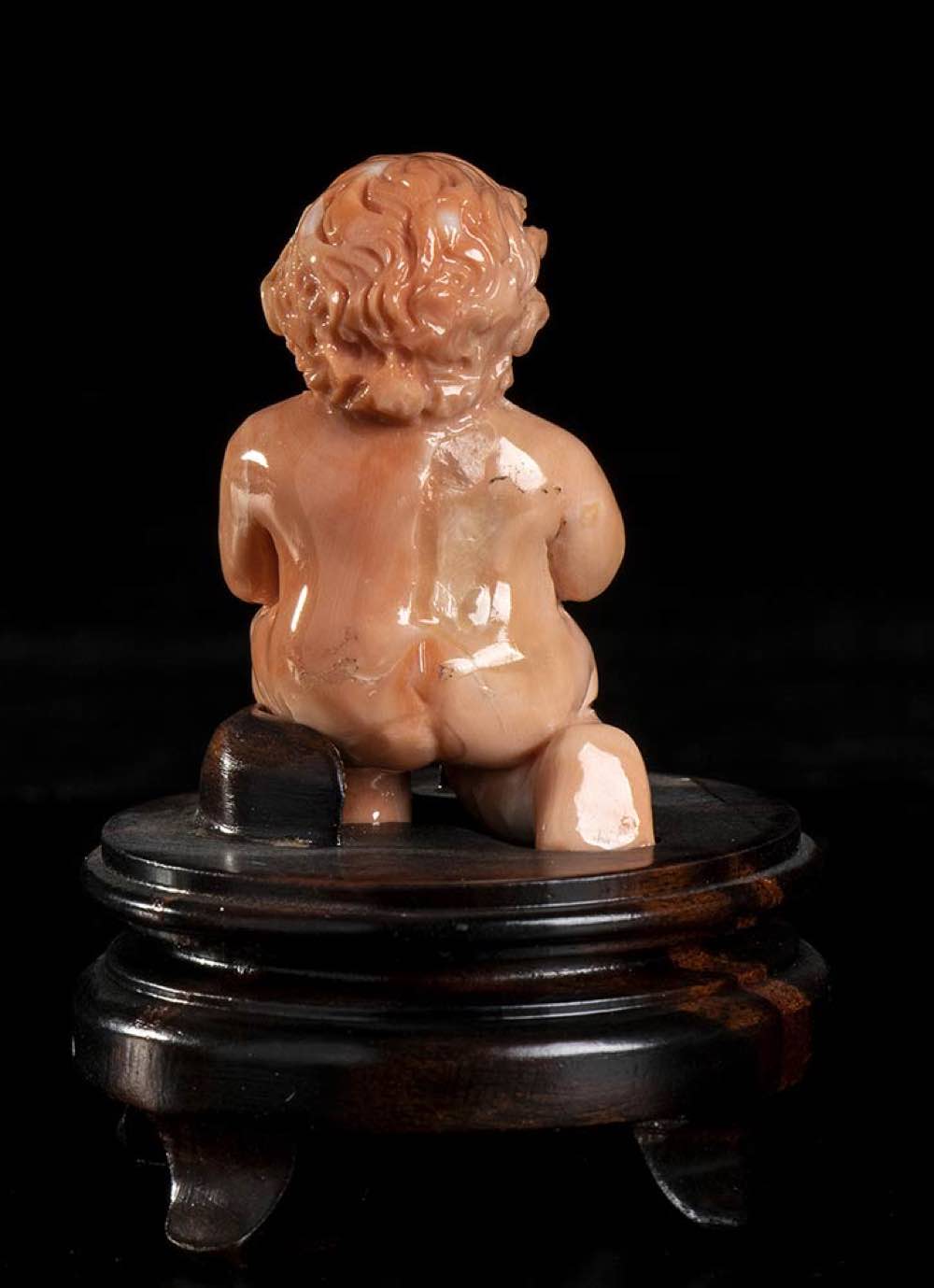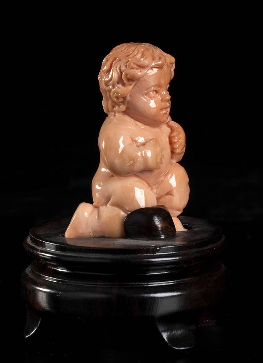 (corallium elatius) raffigurante un putto posto su una base lignea. Dimensioni scultura 4,3 x 2,5 x 2,2 cm, altezza base 2,3 cm, diametro 4,5 cm. Peso scultura 23,7 gr. Stato di conservazione: ***** eccellente.