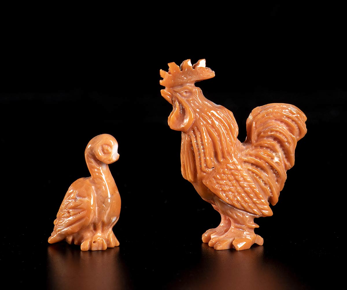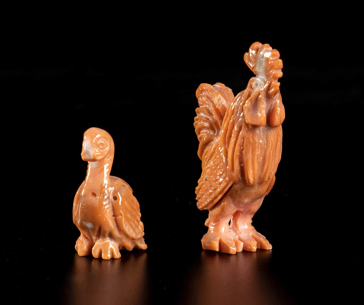 (corallium elatius) raffiguranti un gallo ed un aquilotto. Dimensioni 4,7 x 3,4 x 1,4 cm; 2,9 x 1,5 x 1,4 cm. Pesi 17,5 gr e 7 gr. Stato di conservazione: ***** eccellente.
