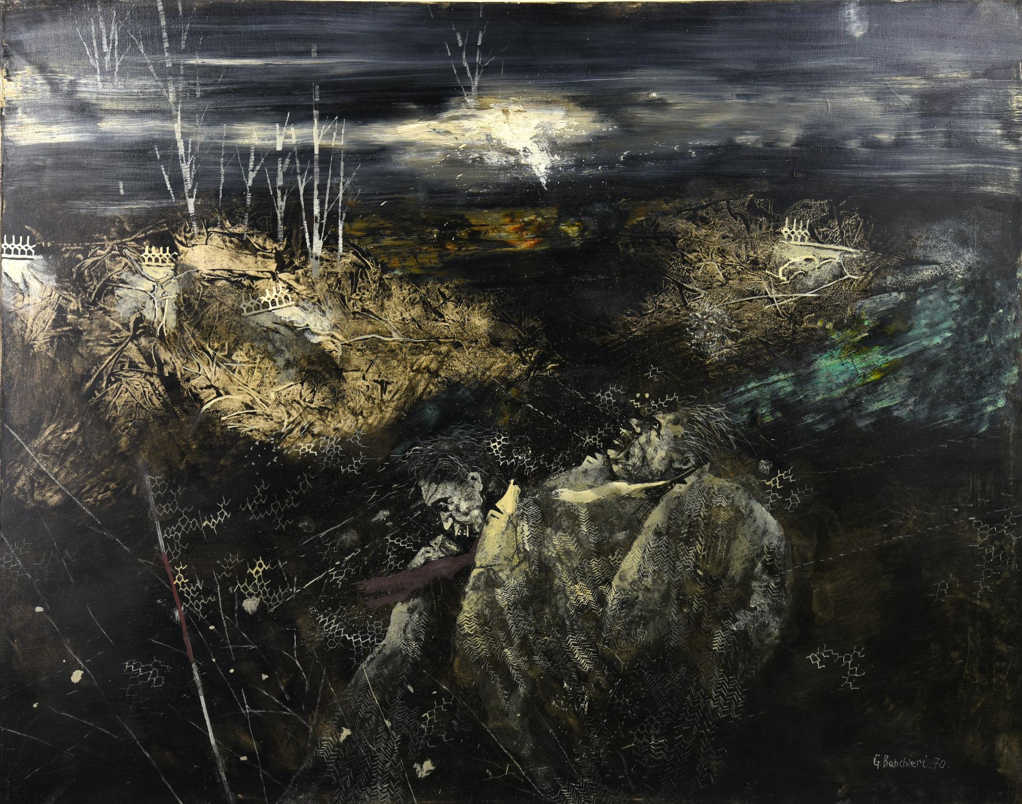 Giuseppe Banchieri (1927 - 1994) FIGURE NEL PAESAGGIO olio su tela, cm 80x100...