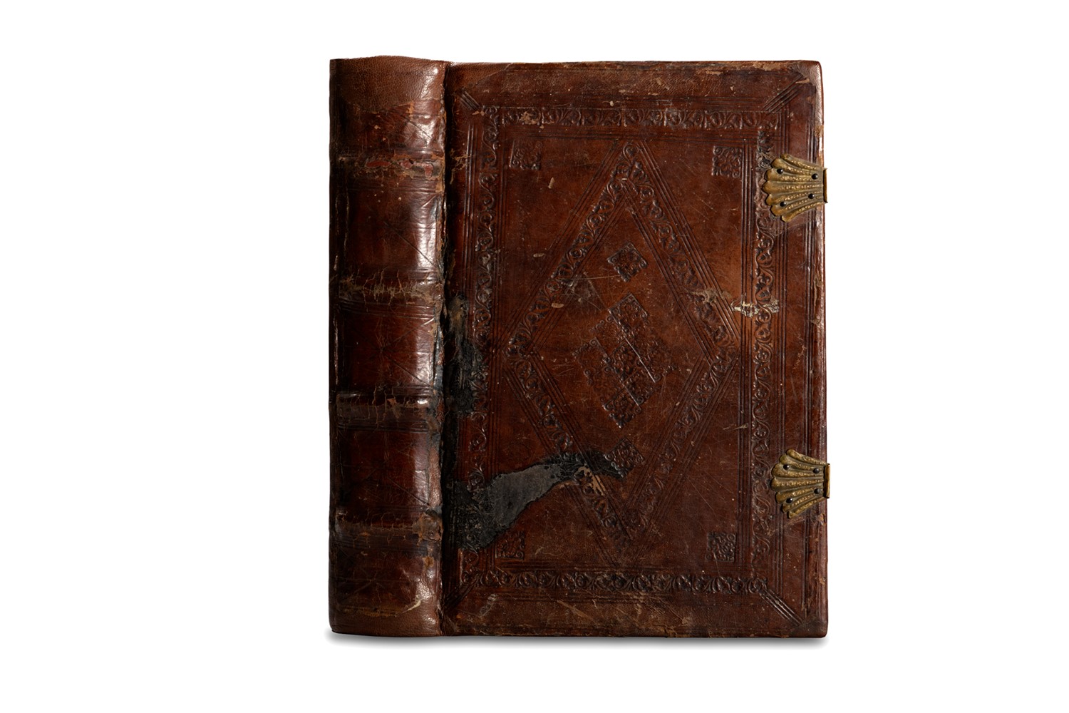 Venezia, Giovanni Battista Sessa, 1575. In 2°. Frontespizio in inchiostro rosso e nero, con vignetta e marca tipografica, capilettera figurati xilografici, carte b10-a1 e Q6-7 con incisione a piena pagina e testo inquadrato da cornice figurata, testo su due colonne in inchiostro rosso e nero, notazioni musicali, mancante a8 e le ultime due carte, piccoli strappi al margine inferiore di poche carte, rari lievi aloni, macchia di inchiostro al margine esterno di KK4 che interessa leggermente il testo, legatura in marocchino marrone, decorazione impressa a secco, piatti inquadrati da una cornice di triplice filetto e rotella, al centro del campo losanga con motivi stilizzati, fermagli in pelle e metallo, restauri, qualche mancanza e macchie, pelle dei fermagli di epoca posteriore.