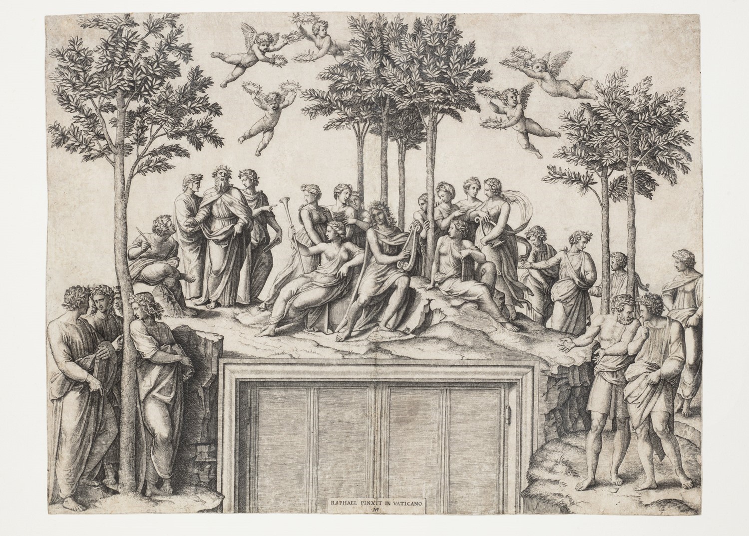 Bulino, c.ca 1514, monogrammato in lastra al centro in basso, IV/IV, stato definitivo, dopo l'aggiunta sopra al monogramma della scritta "Raphael pinxit in vaticano", mm. 350 x 459, assottigliamento a destra, visibile la piega centrale verticale.