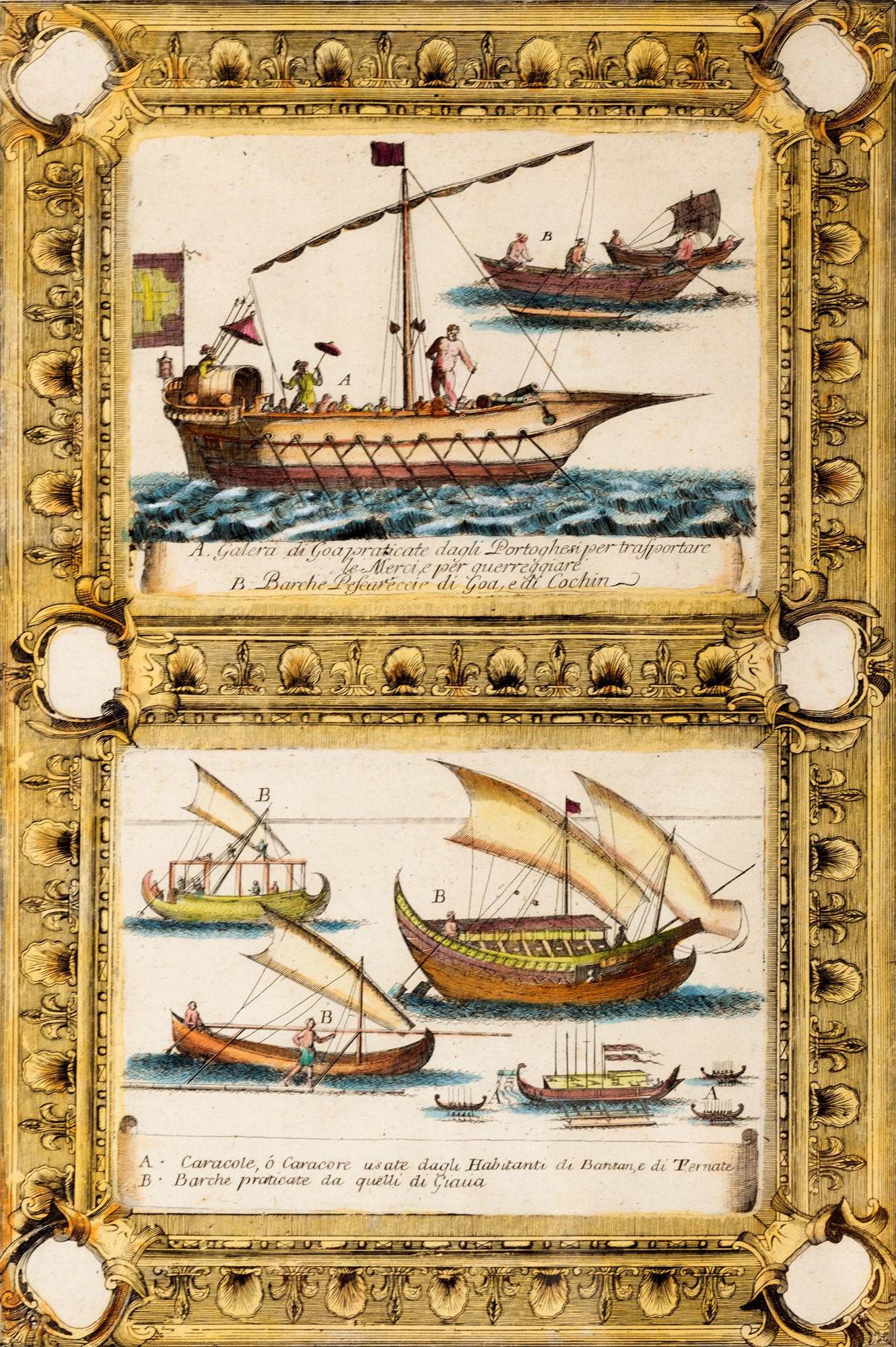 Il foglio è tratto dall'opera l'Atlante Veneto, nel quale si contiene la descrittione […] dell’ universo, stampato a Venezia nel 1690. Entro una ricca cornice decorativa sono illustrate le navi utilizzate in Portogallo, Goa, Cochin, Bantan, Ternate, Giava.