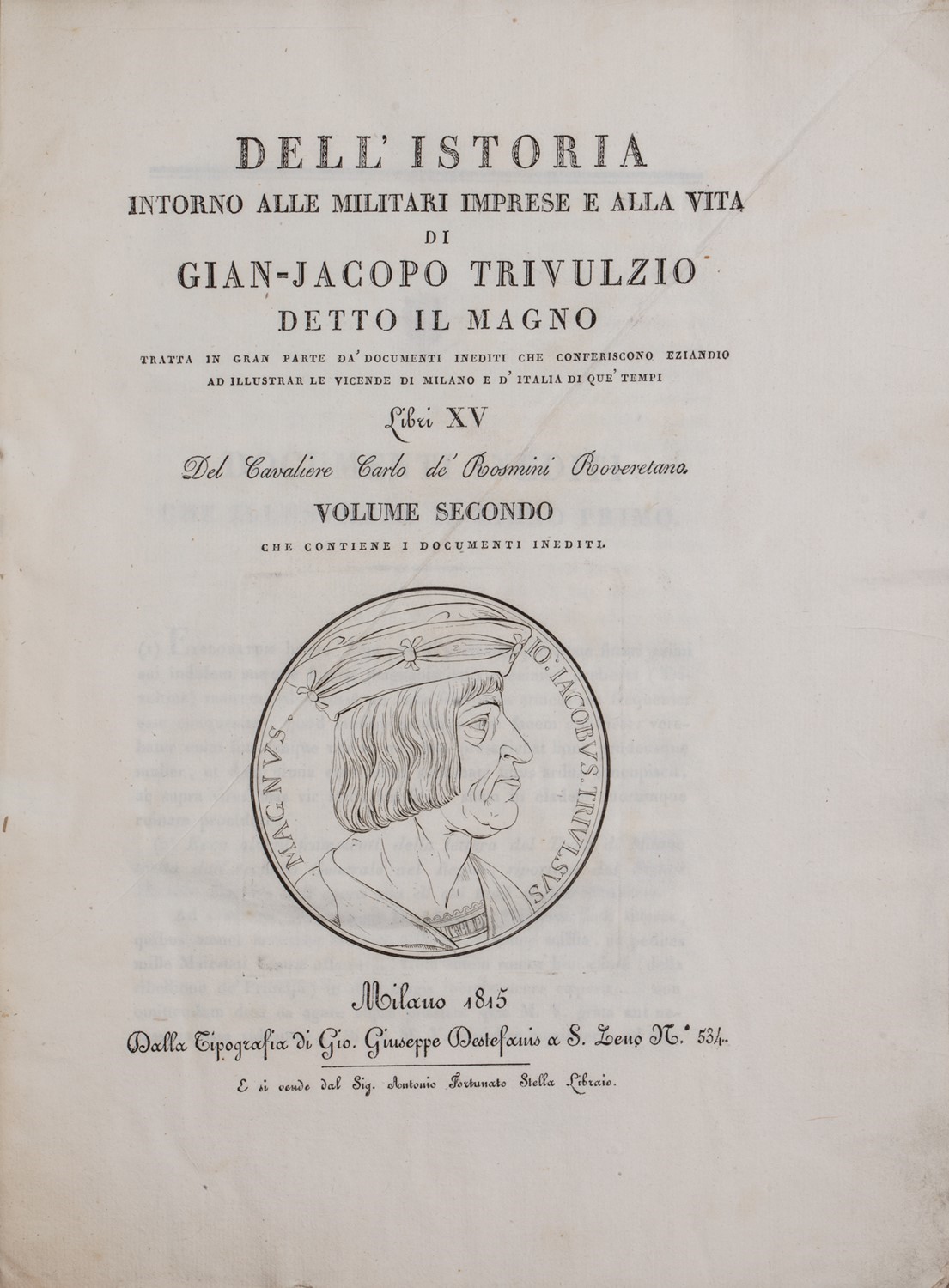 Milano, dalla tipografia di Gio. Giuseppe Destefanis, 1815. In 4°. 2 voll. Medaglioni calcografici con l’effigie di Gian-Jacopo Trivulzio sui frontespizi, esemplare in barbe, piccola mancanza al margine esterno del I frontespizio, brossura editoriale azzurra. § Quattro opuscoli inediti del secolo XVI. Milano, Manini e Rivolta, 1819. In 8°. Esemplare in barbe, raccolto in un foglio di carta blu.§Processo originale degli untori nella peste del 1630. Milano, G. Truffi, 1839. In 4°. Una grande tavola ripiegata incisa in rame fuori testo raffigurante scene della "peste manzoniana” e dei supplizi inflitti agli untori, esemplare in barbe, strappo restaurato al margine della tavola, parte dei fascicoli staccati dalla legatura, brossura editoriale rovinata. Insieme nel lotto altre due edizioni stampate a Milano.
