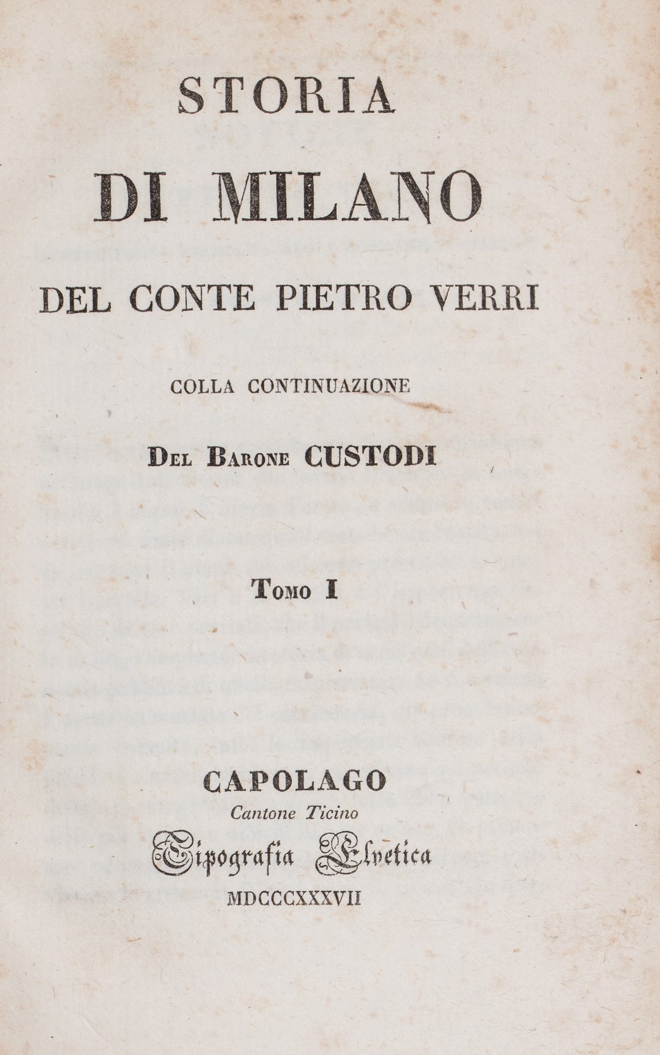 I opera: Hoepli, 969: "Il Custodi rimaneggiò e corresse, come egli stesso dice, quella parte dell'aggiunta del Frisi che aveva visto la luce, e compose di nuovo il rimanente. La nuova edizione col completamento del Custodi vide la luce per la prima volta pei tipi del Destefanis di Milano nel 1824". Interessante e rara opera di divulgazione storica. Predari, p. 198; Caddeo, Ediz. di Capolago, 486.