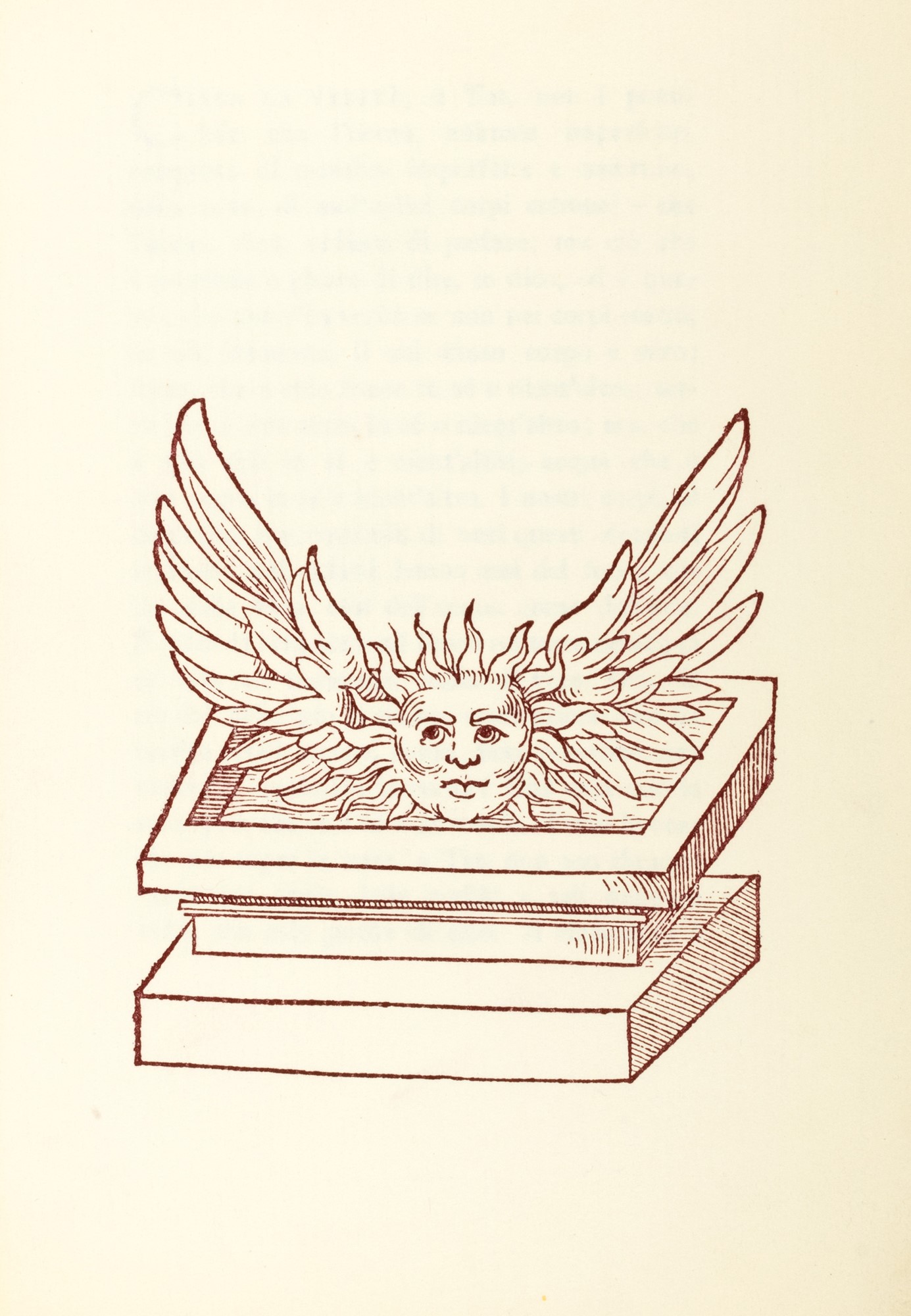 Roma, Enzo e Grazia Crea, 1964. In 2°. Esemplare in barbe, marca xilografica alla prima e ultima carta, fascicoli rilegati con cordoncino in tessuto, legatura coeva in pergamena, piatto inquadrato da cornice impressa in oro con al centro riquadro in carta marmorizzata. § Brentano, Clenes, Lamento primaverile di un servo dall'abisso, Pavia, Luigi Ponzio, 1972. In 2°. Testo in Inchiostro rosso in italiano e tedesco, carte di guardia marmorizzate, legatura in mezzo marocchino rosso e carta marmorizzata, fregi impressi in oro al frontespizio. Esemplare numero 4