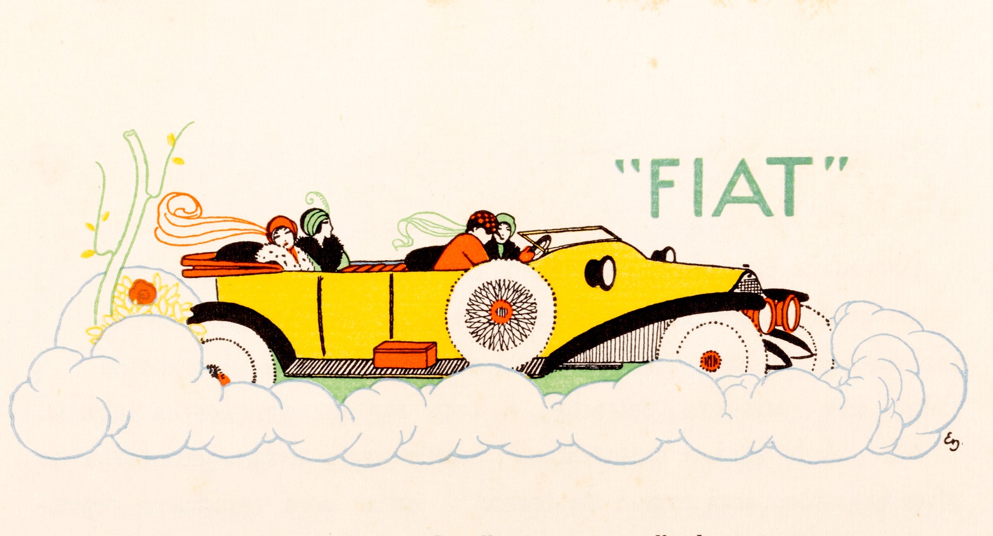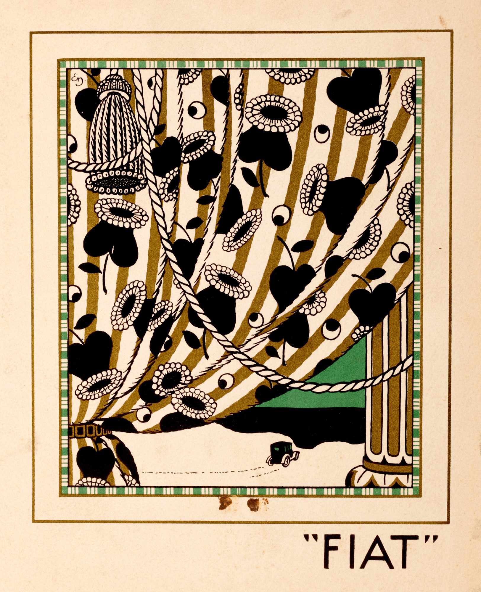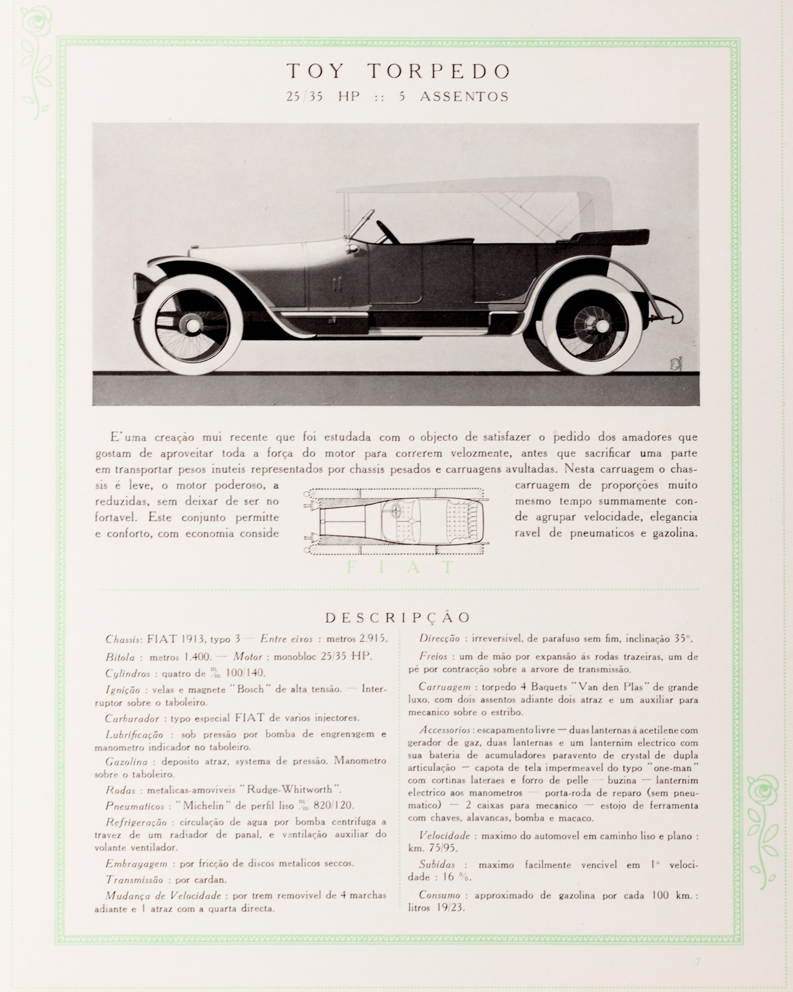 Parigi, Draeger imprimeur, s.d. primi anni del sec. XIX, catalogo in formato in ottavo, testo in portoghese, le prime 4 carte sono decorate a colori, con fregi, figure di donne ed automobili, seguono 24 pagine su carta stampata in bianco e nero, con i modelli delle macchine degli anni 1931 - 14, ciascuna con immagine e descrizione, copertina editoriale in cartoncino avorio, piatto anteriore, illustrato a colori in nero, verde e bianco, lieve macchia.