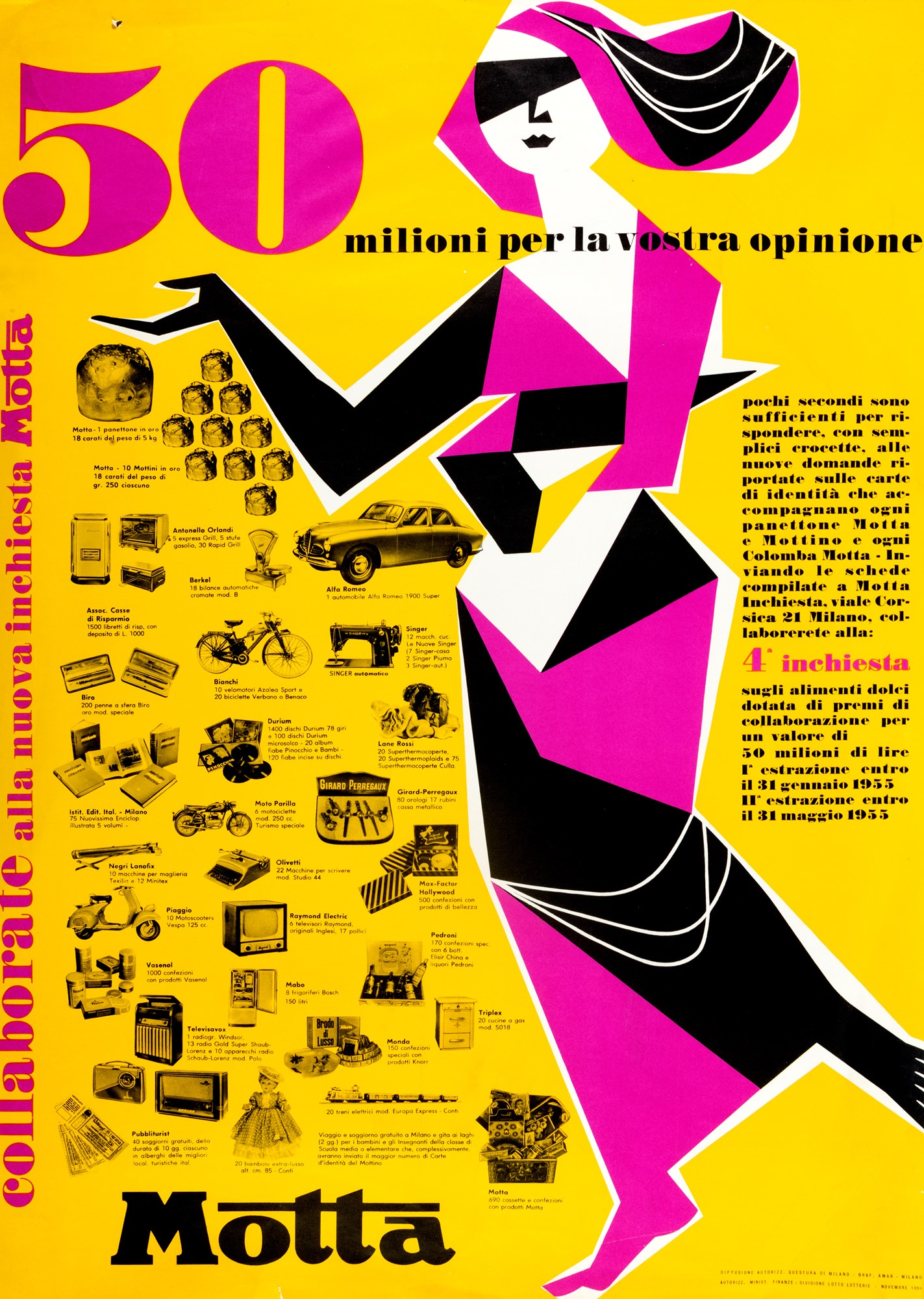 Manifesto pubblicitario originale. Si tratta di uno dei primi concorsi a premi. Importante documento di storia del consumismo: tra i premi in palio le icone dell'epoca: un'Alfa Romeo 1900 Super, la macchina da cucire Singer, la vespa Piaggio, il televisore Raymond Electric, il frigorifero Mabo ecc. Testo: "Pochi secondi sono sufficienti per rispondere, con semplici crocette, alle nuove domande riportate sulle carte di identità che accompagnano ogni panettone Motta e Mottino e ogni Colomba Motta - Inviando le schede compilate a Motta Inchiesta, Viale Corsica 21 Milano, collaborerete alla 4a inchiesta sugli alimenti dolci dotata di premi di collaborazione per un valore di 50 milioni di lire. Ia estrazione entro il 31 gennaio 1955 - 2a estrazione entro il 31 maggio 1955".