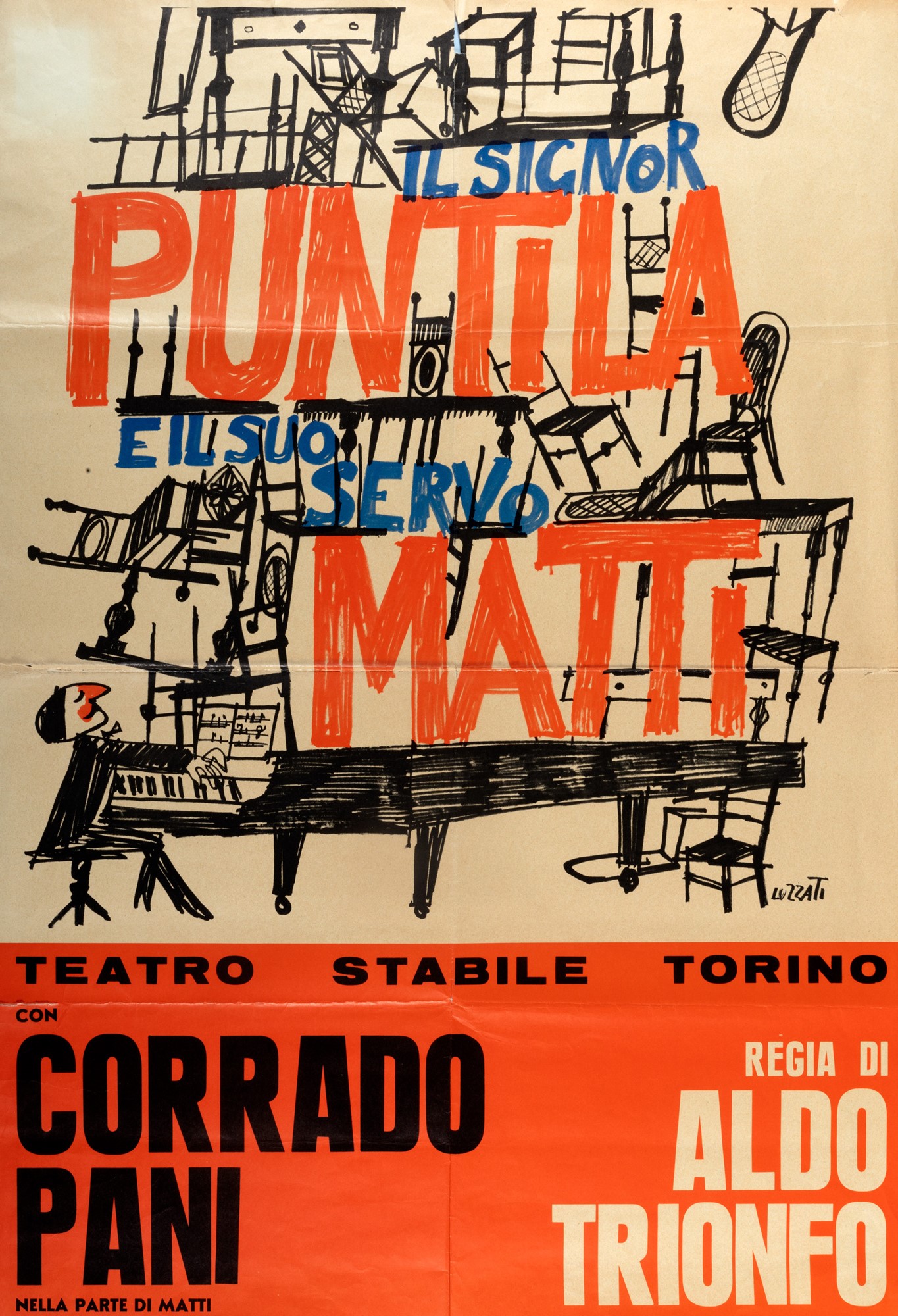 Torino, Teatro Stabile Torino, [stampa: Arti Grafiche F. Garino & C. - Torino], s.d. [gennaio 1971], 100x70 cm., poster, disegno a colori di Emanuele Luzzati. Testo: "Teatro Stabile Torino. Con Corrado Pani nella parte di Matti. Regia di Aldo Trionfo". Tino Buazzelli interpretava il ruolo di Puntila. Alcuni lievi strappetti al margine superiore. Esemplare ripiegato.
