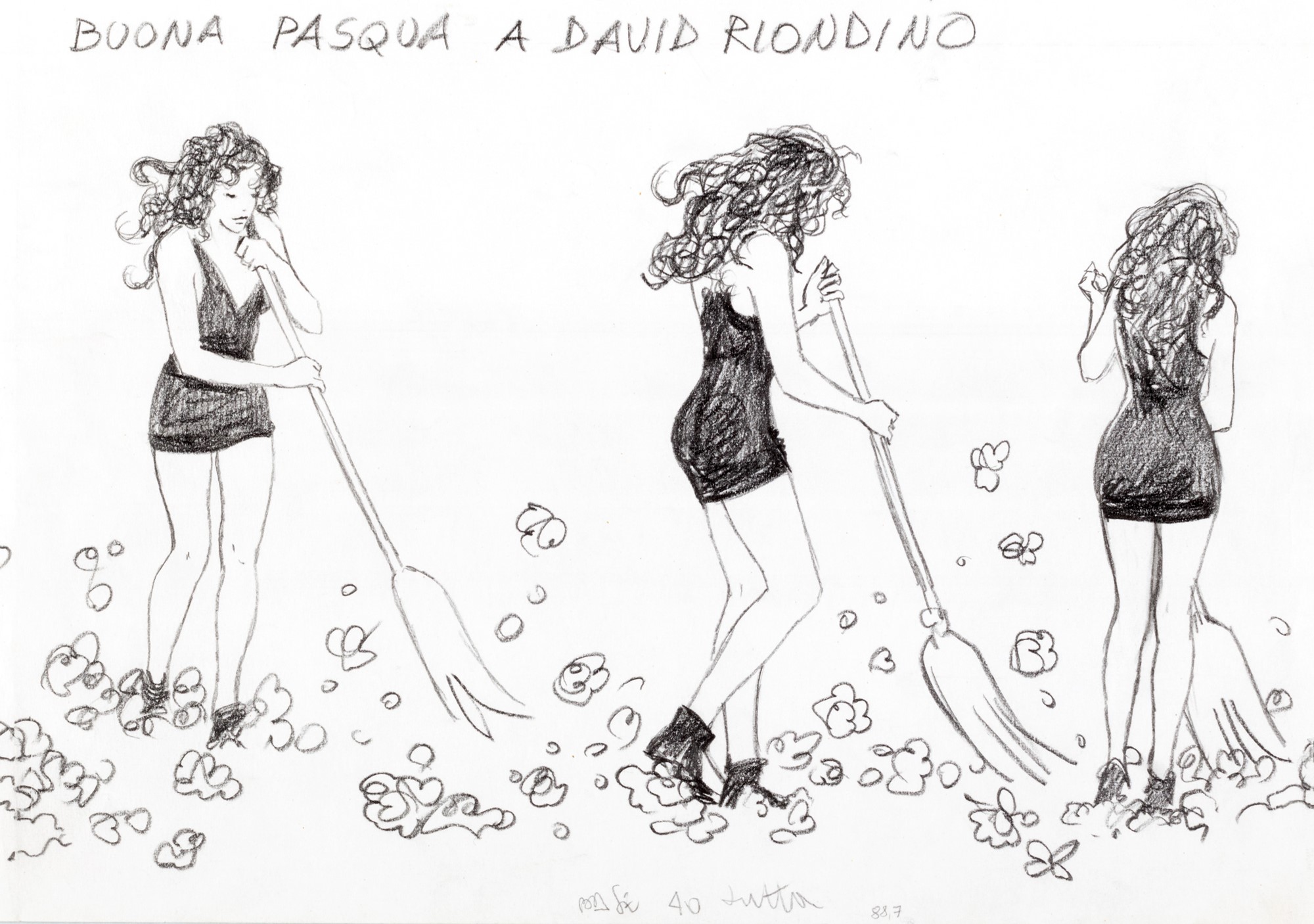 1990 ca., 20,8x29,5 cm., disegno originale a matita di Milo Manara con annotazioni al margine inferiore del foglio. Disegno dedicato all'attore David Riondino. Esemplare non firmato.