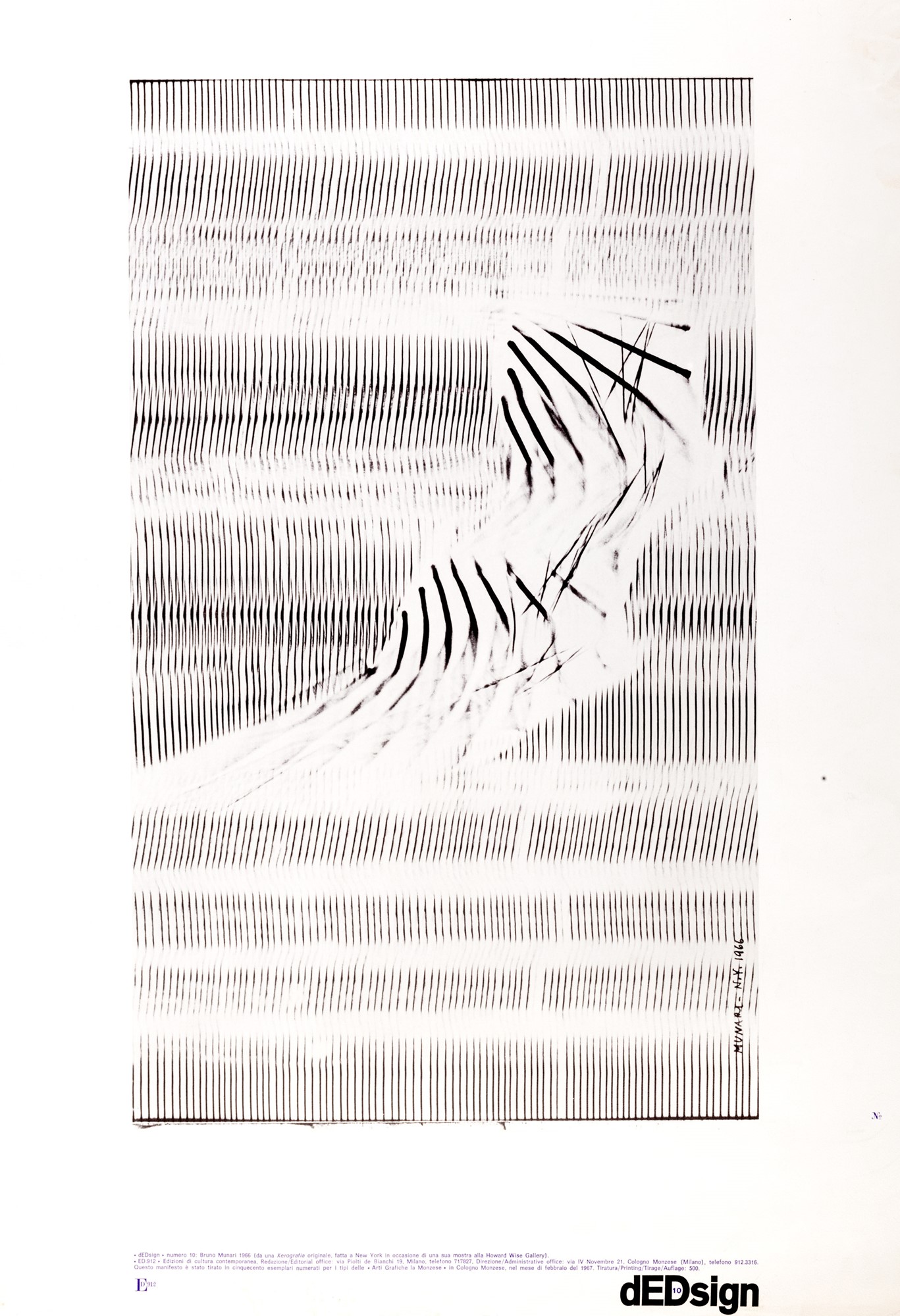 (Milano), (ED.912 Edizioni di Cultura Contemporanea - serie "dEDsign - n. 10"), [stampa: Arti Grafiche La Monzese - Cologno Monzese], s.d. [febbraio 1967], 70x50 cm., poster stampato al solo recto, poster illustrato con una composizione grafica in bianco e nero. Allegata una lettera dattiloscritta con saluti e firma autografi in penna rossa, inviata da Bruno Munari a Gianni Emilio Simonetti, foglio di carta intestata «Carpenter Center for The Visual Arts - Harvard University», datata 26 aprile 1967; 22,8x15,3 cm., 22 righe. Esemplare nella prima edizione, seconda tiratura, senza colophon né indicazione della serie.