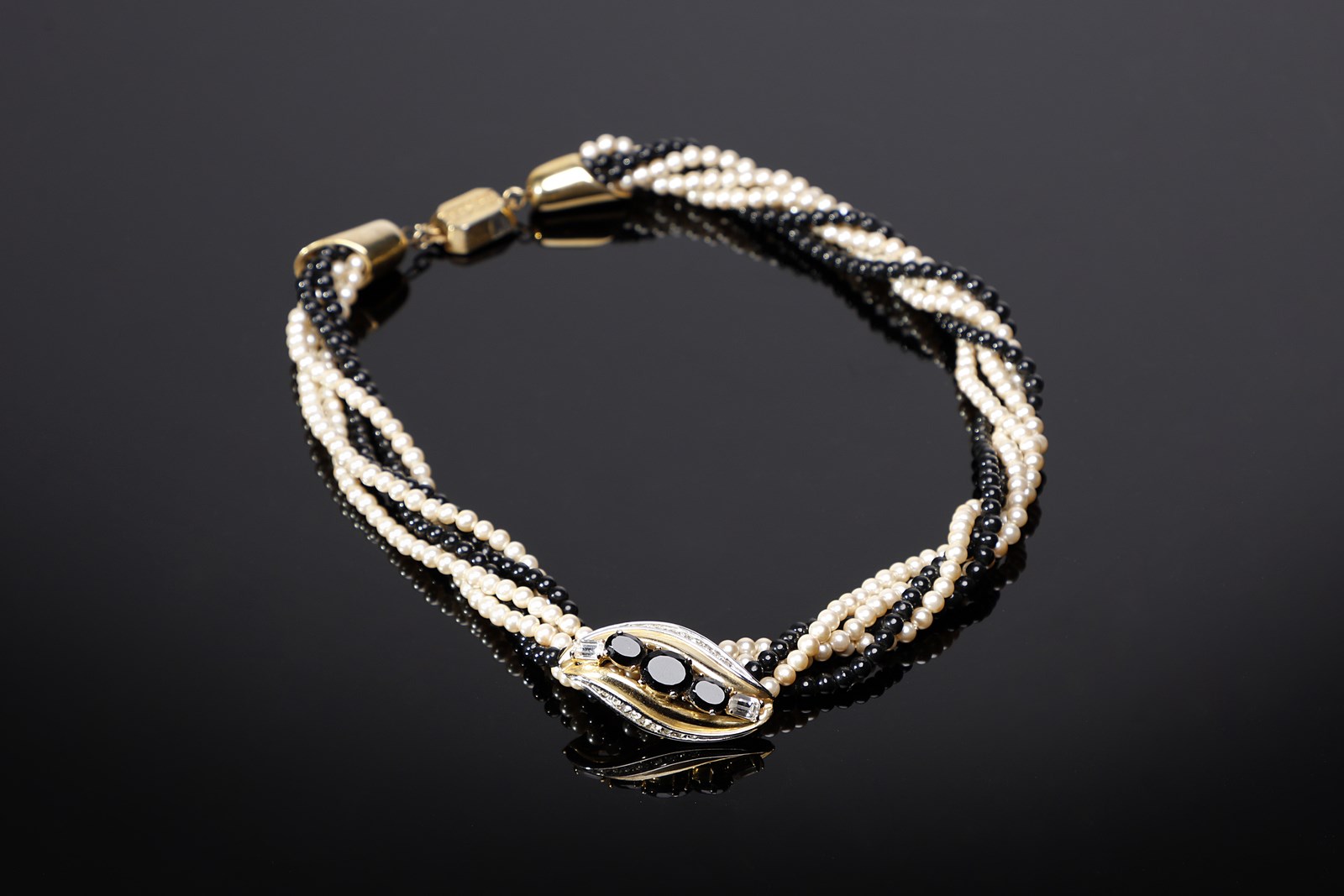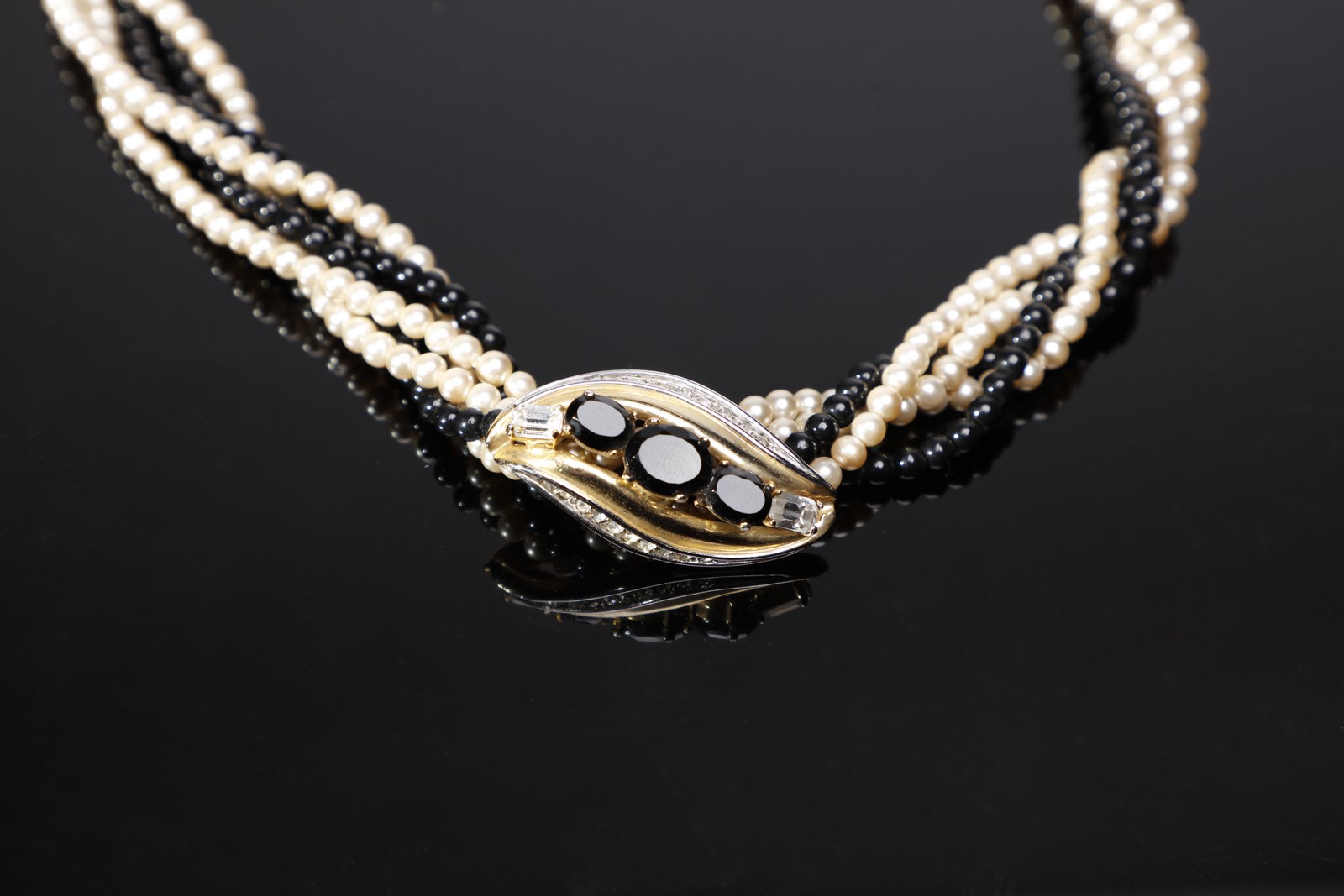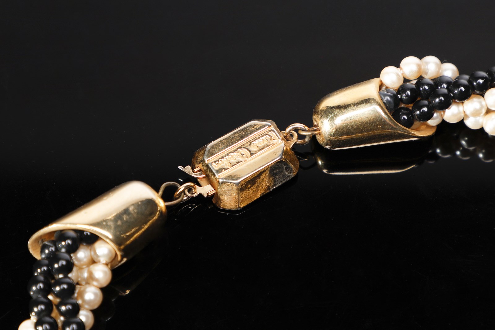 CARDIN PIERRE Collier torchon con fili di perle artificiali colorate bianche e nere. Fibbia a forma di foglia stilizzata con strass bianchi e neri. -. .