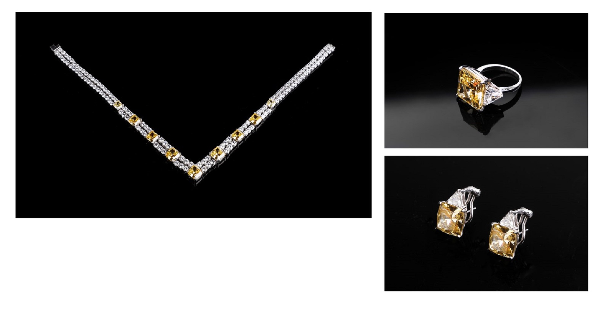 BURMA Parure in argento e pietre dure sintetiche (burmalite) bianche e gialle, composta da collana,coppia di orecchini e anello. Burmalite. . Box presente.