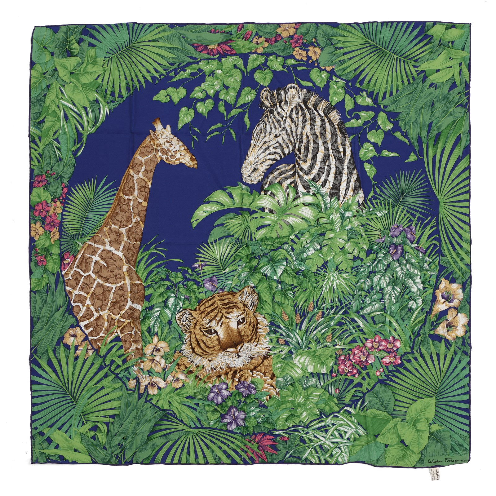 FERRAGAMO SALVATORE Foulard in seta. Tigre, giraffa e zebra su fondo blu. Seta. Cm 84,00 x 84,00. Presente etichetta Salvatore Ferragamo - Made in Italy.